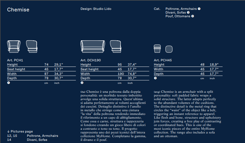 The sofa is completed by the new ottoman version of Chemise: an object boasting a multitude of functions, sometimes used as a seat, and others as a footrest. Roundness appears to be the order of the day for this small furnishing which lends its surroundings a fun and original style.