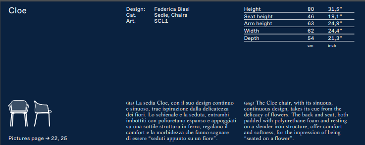 A sinuous, continuous design that draws its inspiration from the delicacy of flowers: this is the emblem of the Cloe armchair, which was devised to furnish stylish, contemporary livingrooms. The seat and backrest, both padded with polyurethane foam and resting on a slim iron frame with copper hues, afford impeccable comfort and softness just like ‘being seatedon a flower’.