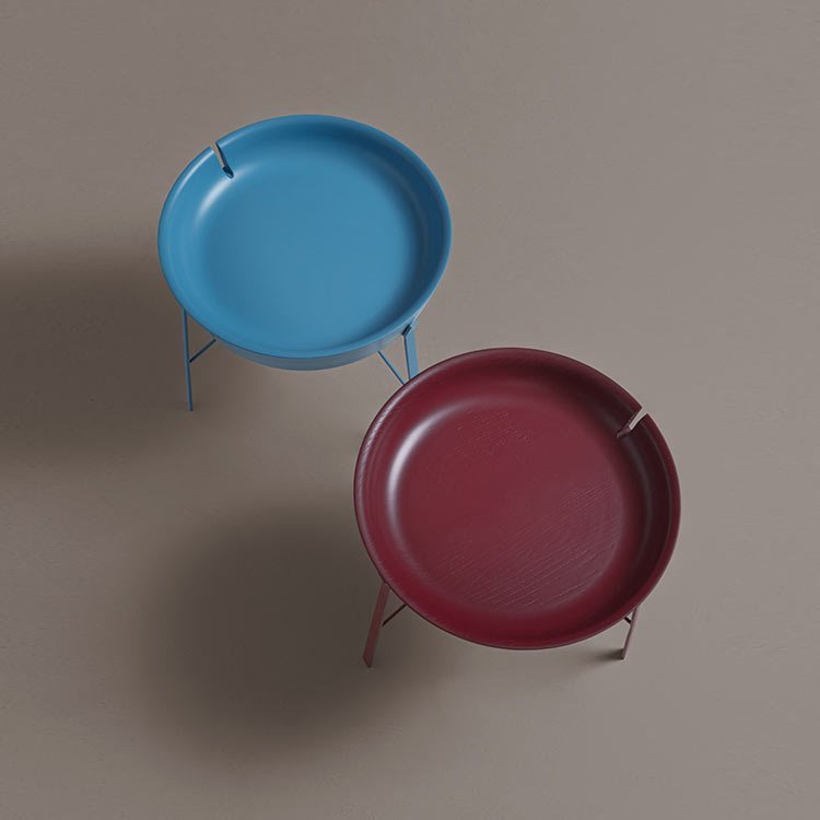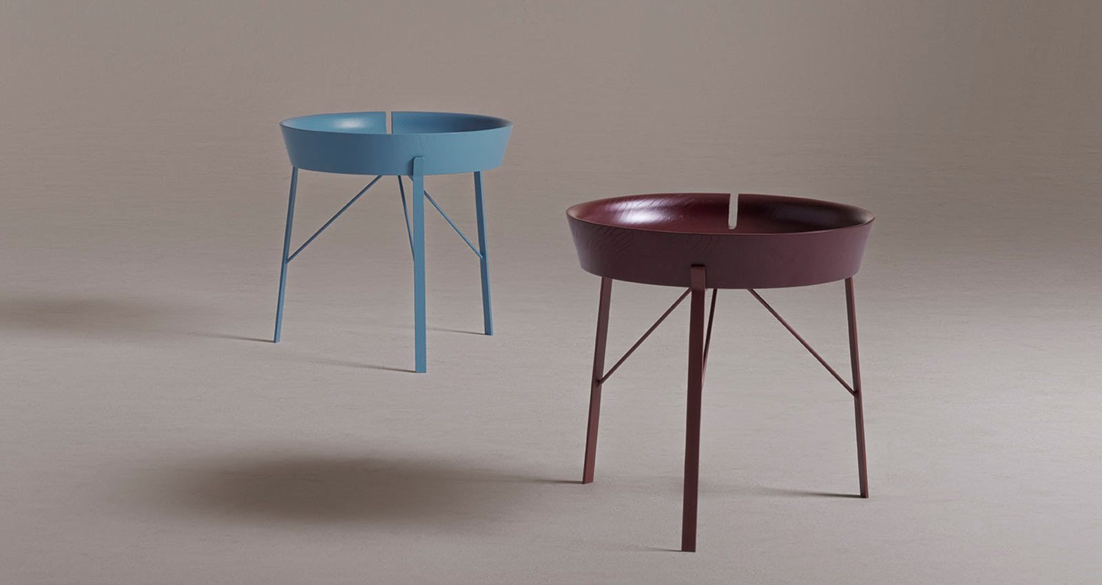Cocoon a round table with three slim legs, in which the high borders of the top are like the sides of a basket, a nest that surrounds and protects whatever is placed on the surface.