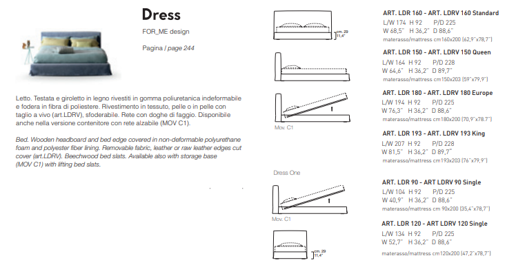 Bed. Wooden headboard and bed edge covered in non-deformable polyurethane foam and polyester fiber lining. Removable fabric, leather or raw leather edges cut cover. Beechwood bedslats. Available also with storage base with lifting bed slats.