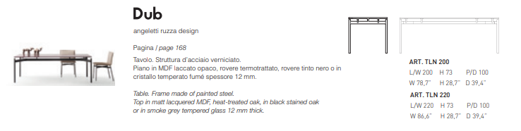 Table. Frame made of painted steel. Top in matt lacquered wood, in heat-treated oak, in black stained oak or in smoke-grey tempered glass, 12mm thick.