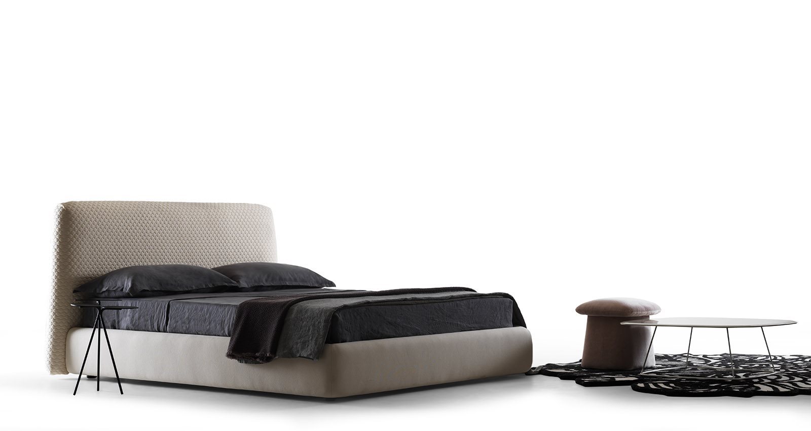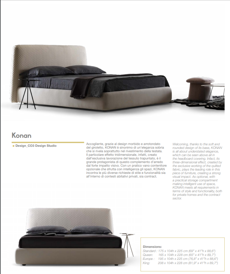 Welcoming, thanks to the soft and rounded design of its base, Konan is all about understated elegance, which can be seen above all in the headboard covering. Infact, its three-dimensional effect, created by the exclusive working of the quilted knitted fabric, orquilted velvet, plays the leading role in this piece of furniture, creating a strong visual impact. With a practical storage compartment making intelligent use of space, Konan meets all requirements in terms of style and functionality, both for private homes and the contract sector.
