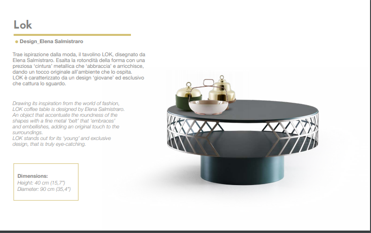 Drawing its inspiration from the world of fashion, LOK coffee table is designed by Elena Salmistraro. An object that accentuate the roundness of the shapes with a fine metal ‘belt’ that ‘embraces’ and embellishes, adding an original touch to the surroundings. LOK stands out for its ‘young’ and exclusive design, that is truly eye-catching.