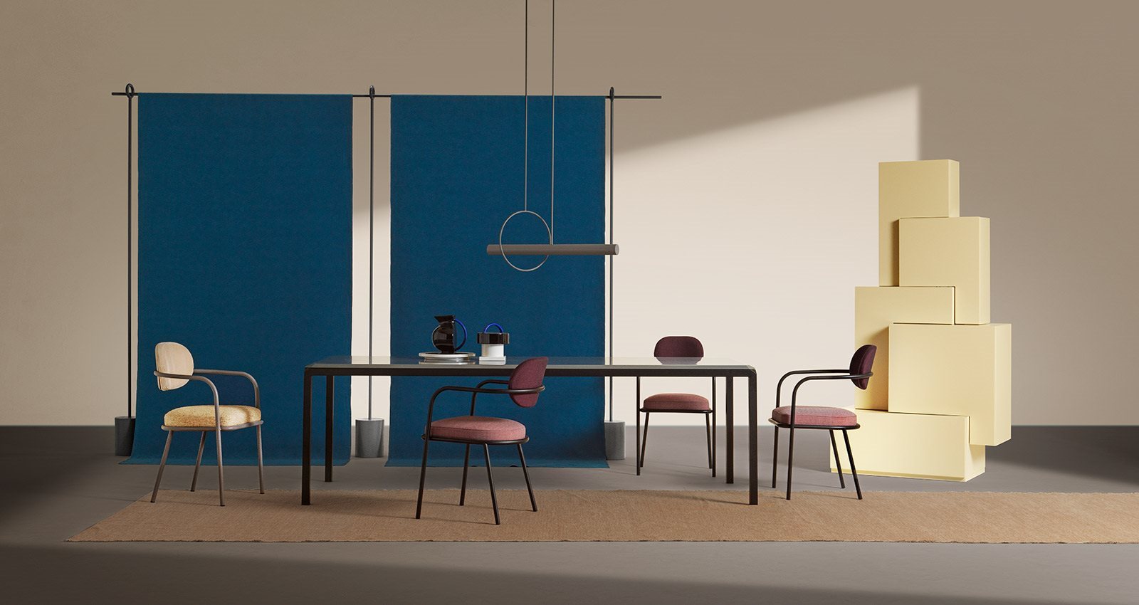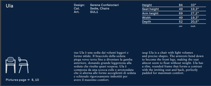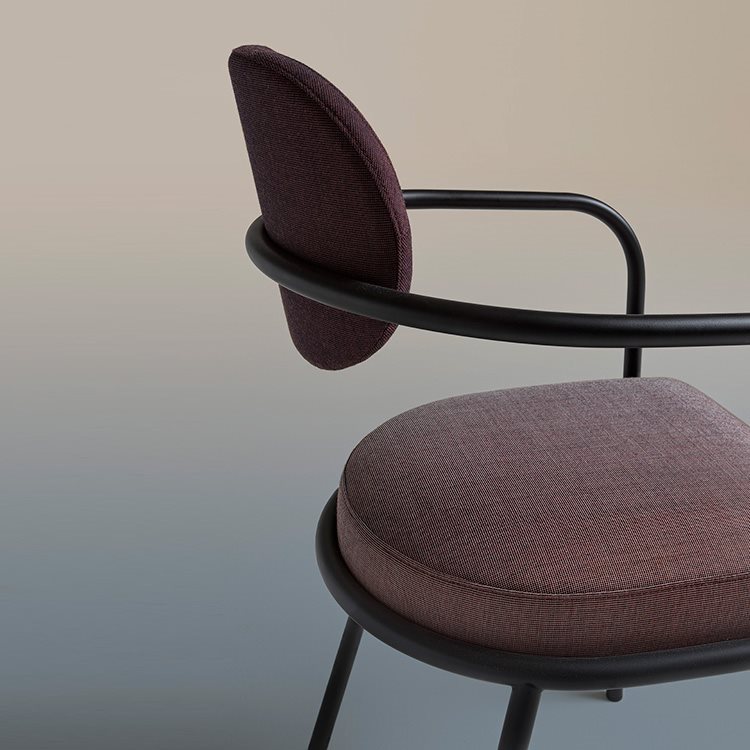 The Baba armchair designed by Serena Confalonieri has been supplemented with a lighter version of ULA, in the chair version. The seat armrest bends down towards the floor, to such an extent that it becomes its front leg, giving the chair itself a truly light-weight appearance, making it look almost suspended. Distinguished by their curved tubular frame and fabric upholstery, Ula & Baba stand out for their slim, rounded body which alternates with the welcoming shapes of the padded seat and backrest.