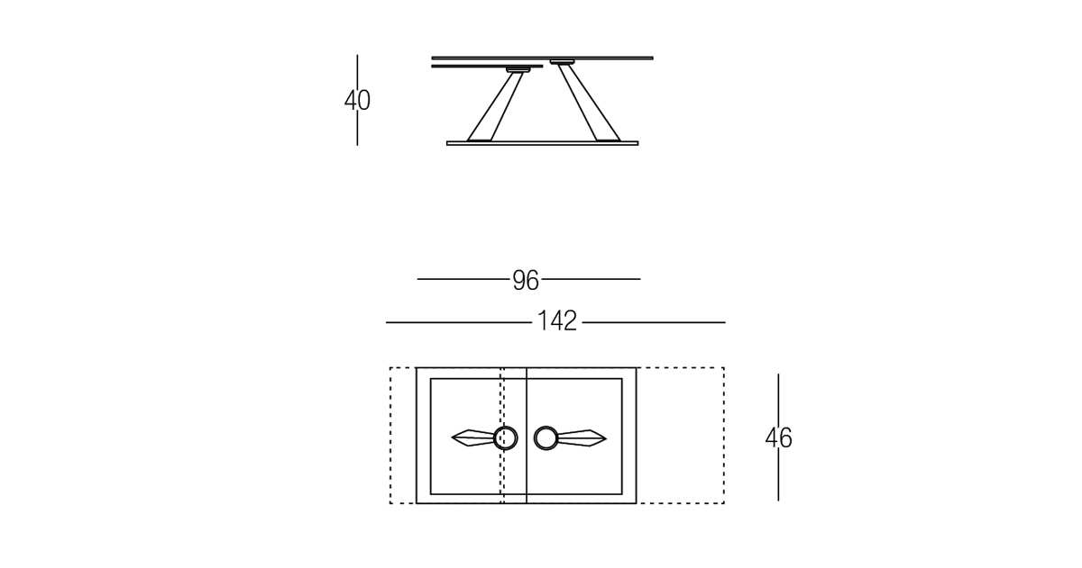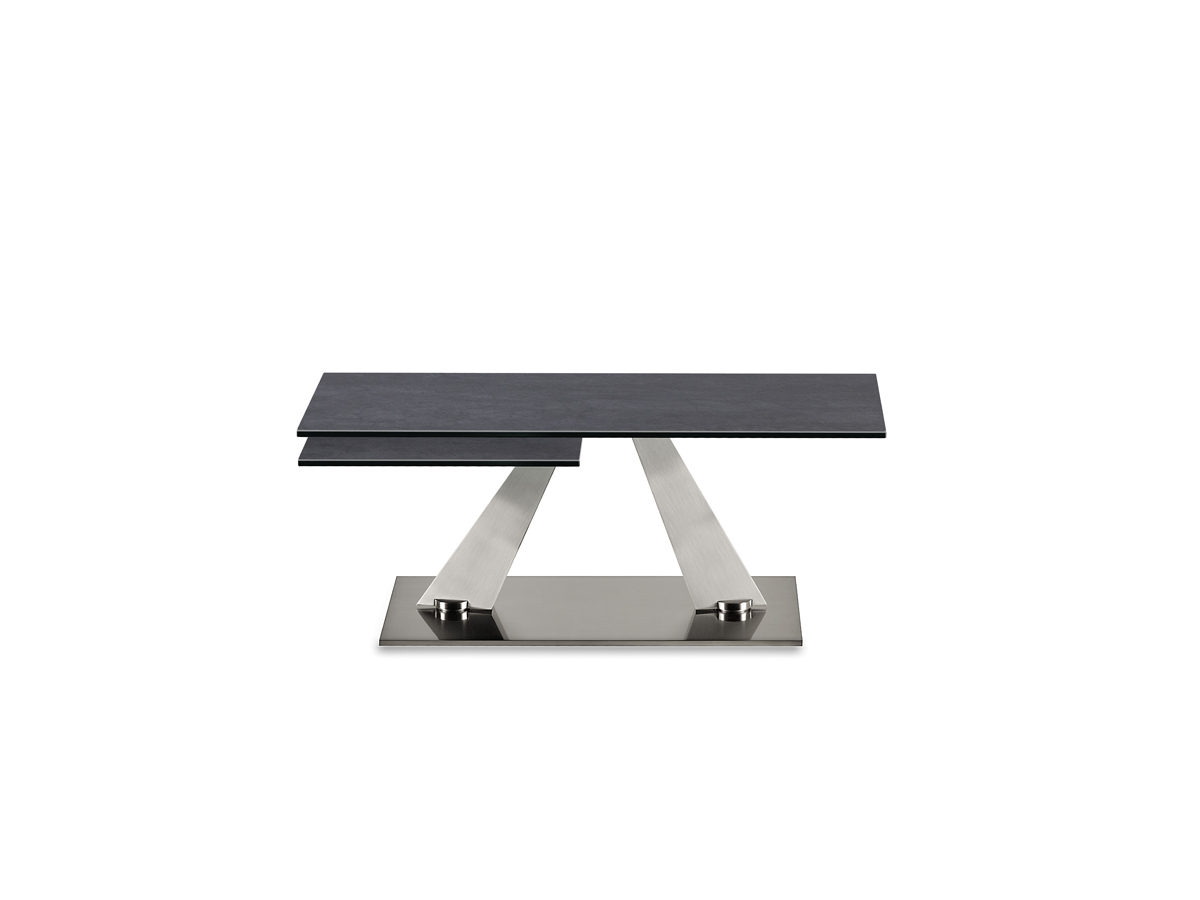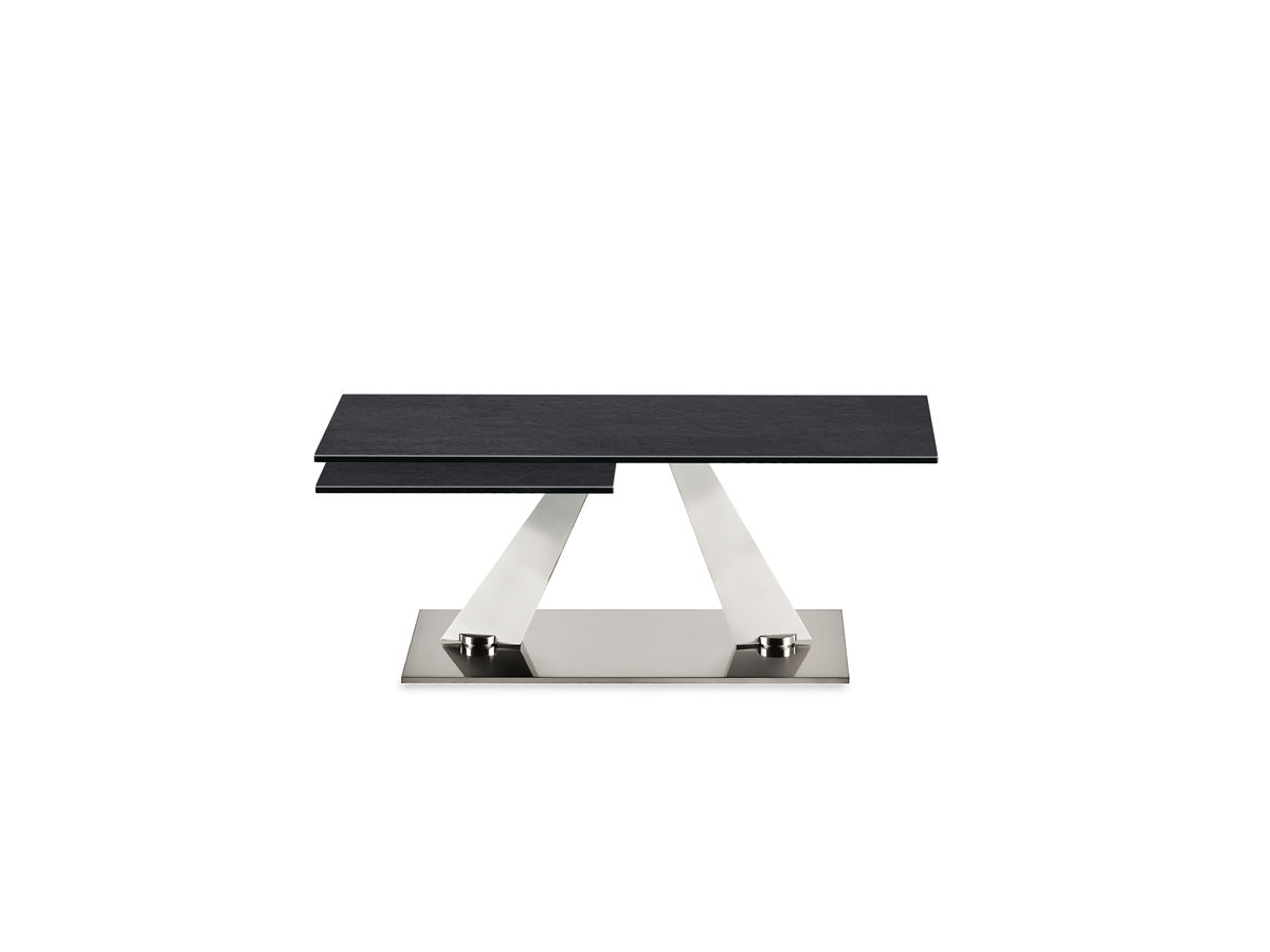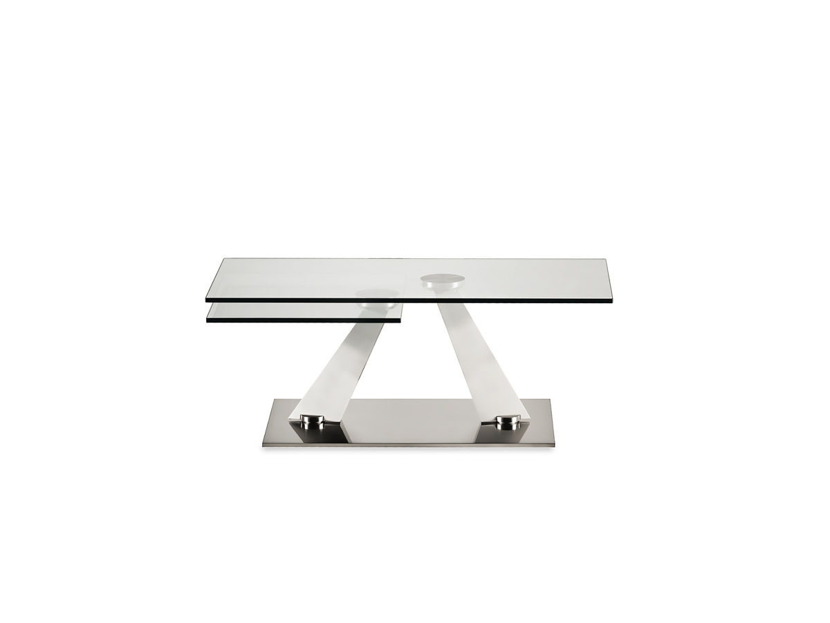 TAVOLINO ESTENSIBILE CON PIANI IN CRISTALLO GIREVOLI SINCRONIZZATI. BASE E SUPPORTI IN ACCIAIO VERNICIATO O GALVANIZZATO. DISPONIBILE ANCHE CON PIANI IN CERAMICA.