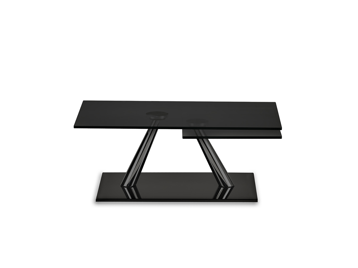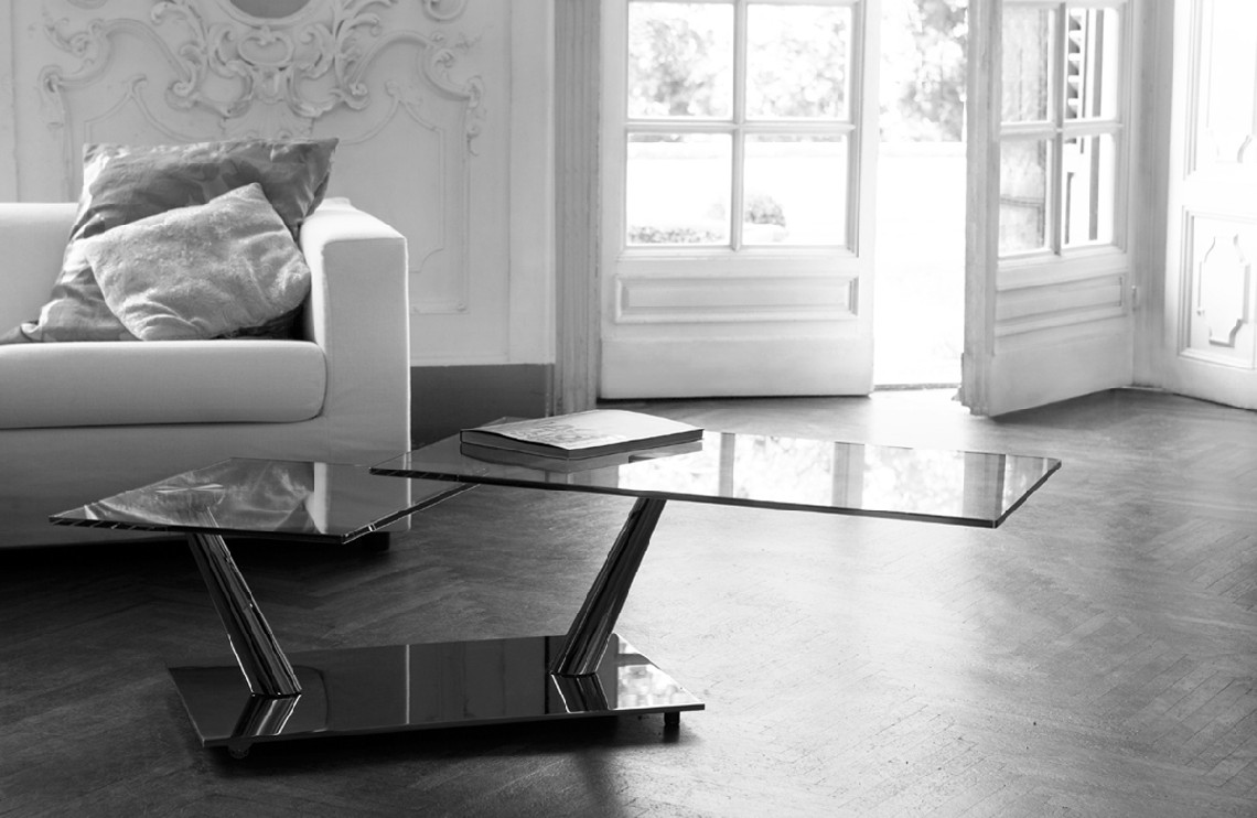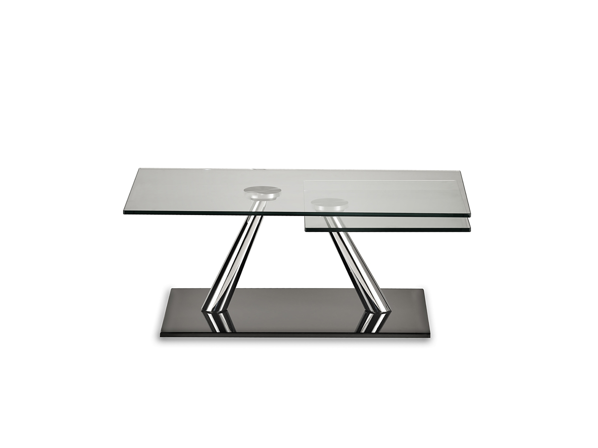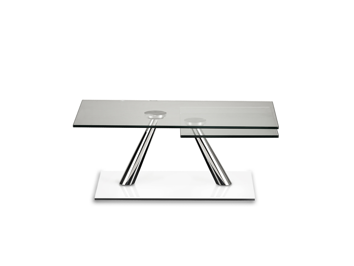 TAVOLINO ESTENSIBILE CON PIANI IN CRISTALLO GIREVOLI SINCRONIZZATI. BASE IN CRISTALLO STRATIFICATO. SUPPORTI IN ACCIAIO VERNICIATO O GALVANIZZATO. DISPONIBILE ANCHE CON PIANI IN CERAMICA.
