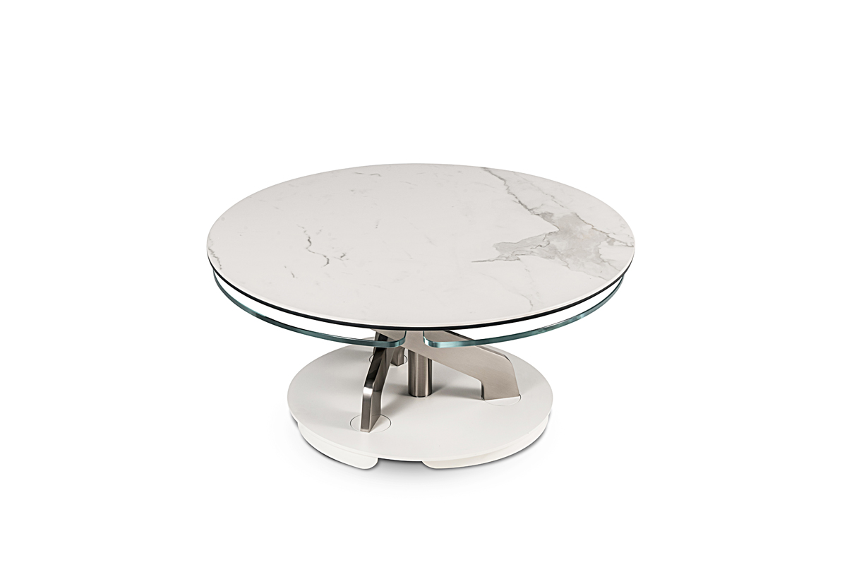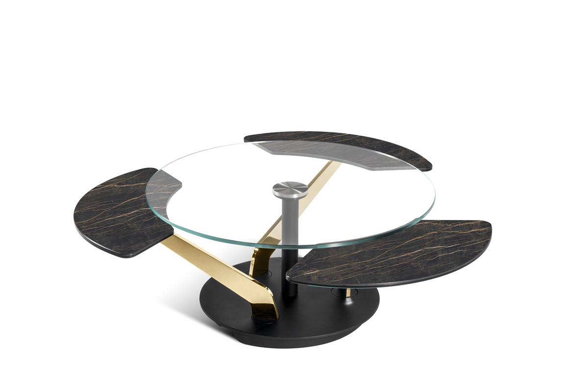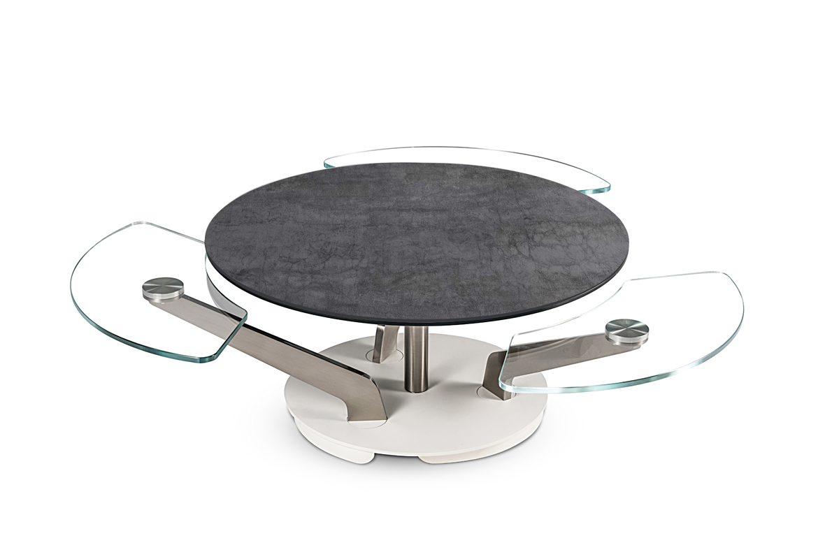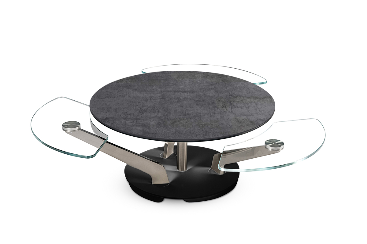 TAVOLINO ESTENSIBILE DOTATO DI UN INNOVATIVO MECCANISMO CHE , ATTRAVERSO LA SOLA ROTAZIONE A 360° DEL PIANO SUPERIORE, PERMETTE AI TRE PIANETTI SOTTOSTANTI DI APRIRSI. IN POSIZIONE CHIUSA IL PIANO SUPERIORE NASCONDE I PIANI SOTTOSTANTI.