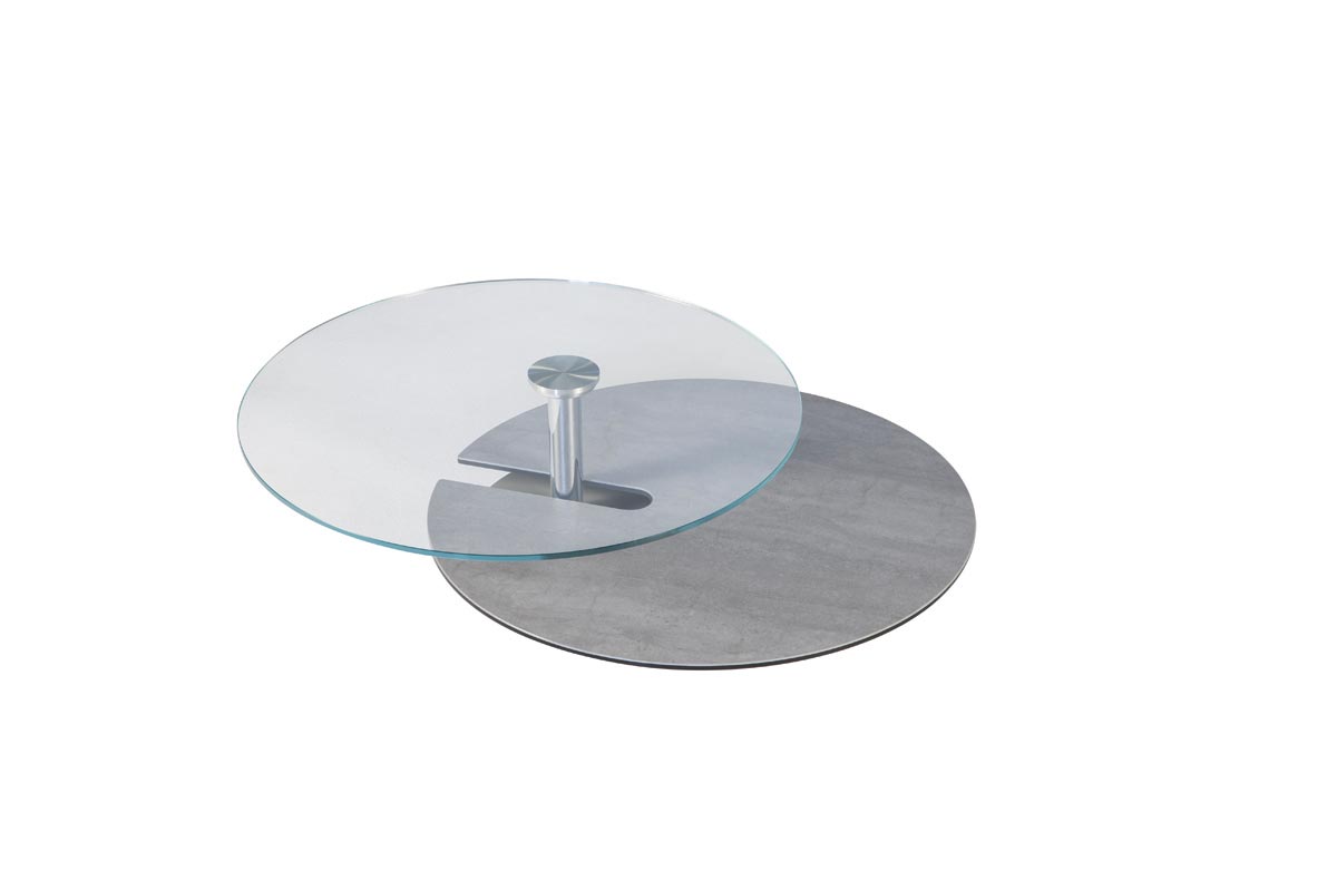 TAVOLINO ESTENSIBLE CON MECCANISMO SINCRONIZZATO: CON LA ROTAZIONE DEL PIANO SUPERIORE SI OTTIENE L’ESTENSIONE DEL PIANO INFERIORE CHE SI SPOSTA ORIZZONTALMENTE ALL’ESTERNO. DISPONIBILE CON PIANI IN VETRO O CERAMICA. SUPPORTO CROMATO.