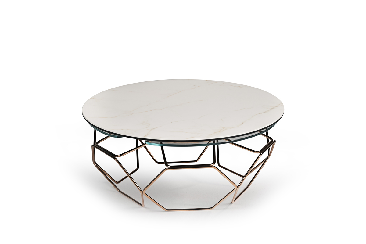 TAVOLINO ESTENSIBILE CON PIANI IN CERAMICA E CRISTALLO, BASE IN ACCIAIO VERNICIATO O GALVANIZZATO. DOTATO DI UN INNOVATIVO MECCANISMO CHE, ATTRAVERSO LA SOLA ROTAZIONE DEL PIANO SUPERIORE, PERMETTE AI TRE PIANETTI SOTTOSTANTI DI APRIRSI. DISPONIBILE ANCHE SENZA MECCANISMO.