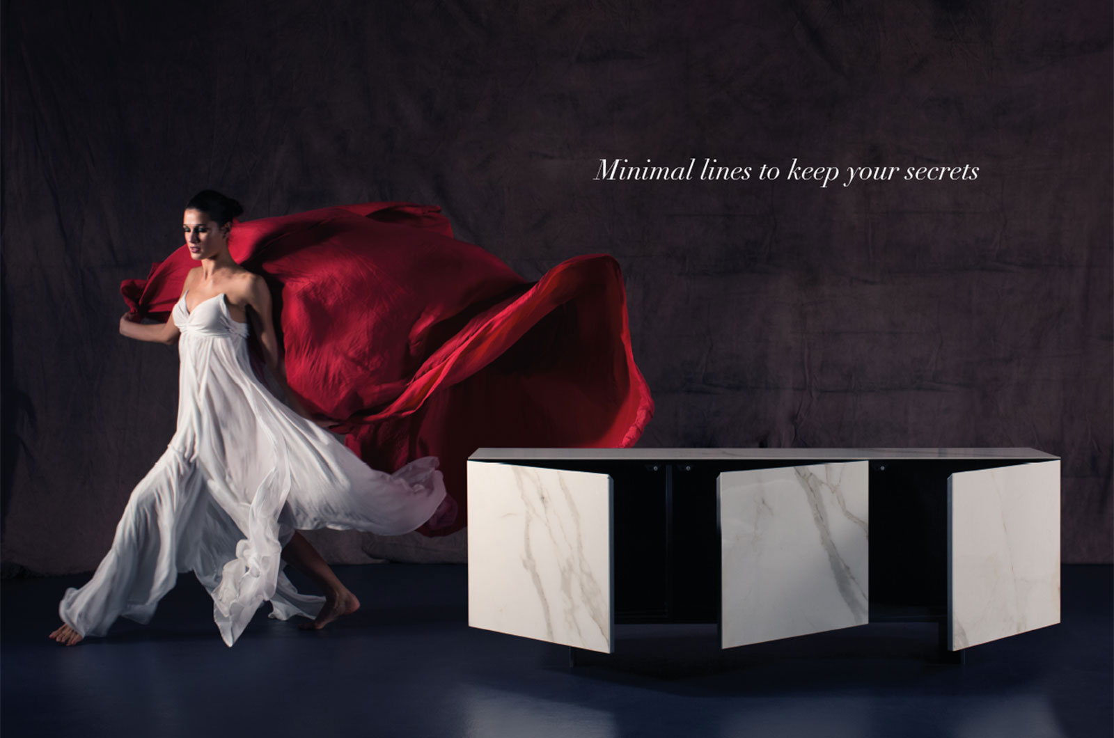 MADIA CONTENITORE 3 ANTE IN LEGNO CON RIVESTIMENTO PIANO SUPERIORE E ANTE IN CERAMICA. RIPIANI INTERNI IN CRISTALLO. CERNIERE CON APERTURA AUTOMATICA E BLOCCO IN CHIUSURA.