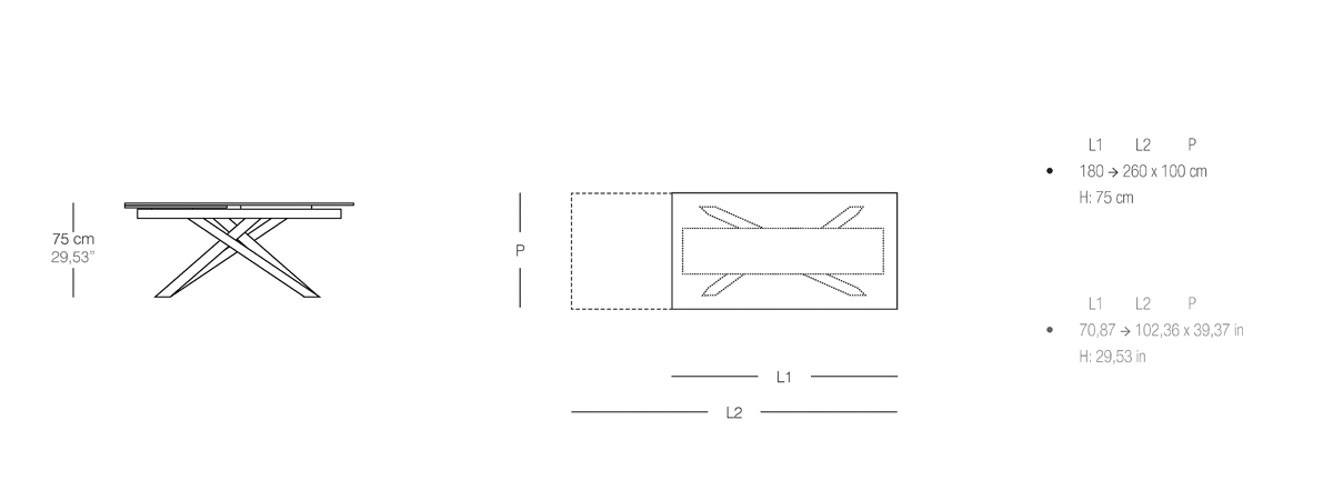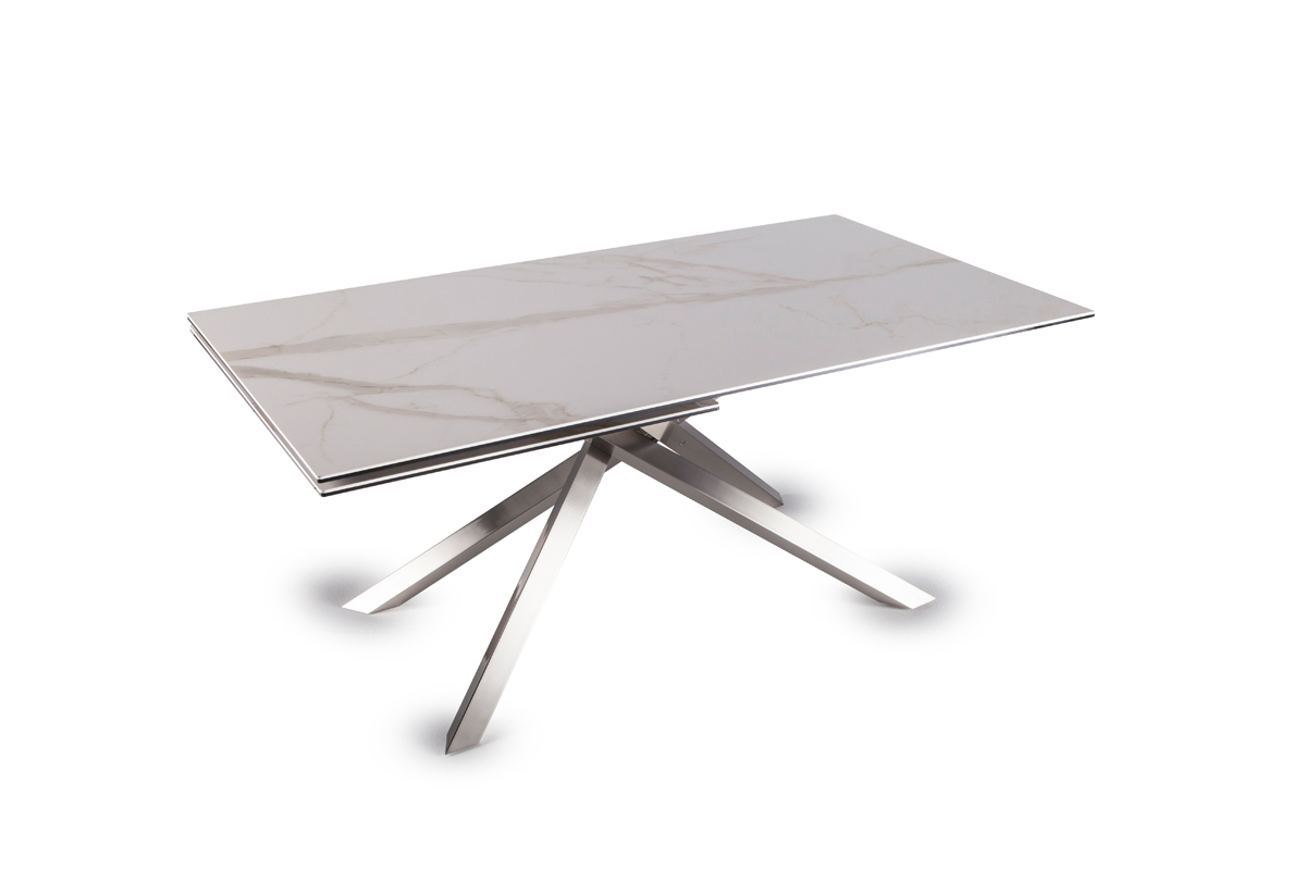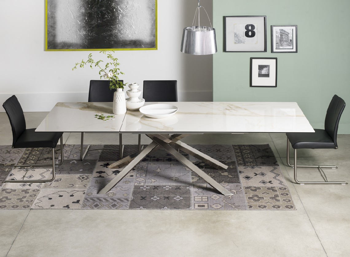 TAVOLO PRANZO ESTENSIBILE  CON PIANO E PROLUNGA IN CRISTALLO O CERAMICA. GAMBE  IN ACCIAIO VERNICIATO DOTATO DI UN MECCANISMO INNOVATIVO :    LA ROTAZIONE  DI UNA  SOLA  PROLUNGA PERMETTE AL  PIANO CENTRALE  DI ALLONTANARSI O AVVICINARSI , MANTENENDO SEMPRE UNA POSIZIONE CENTRATA  RISPETTO ALLA STRUTTURA.D. D'Urbino P. Lomazzi