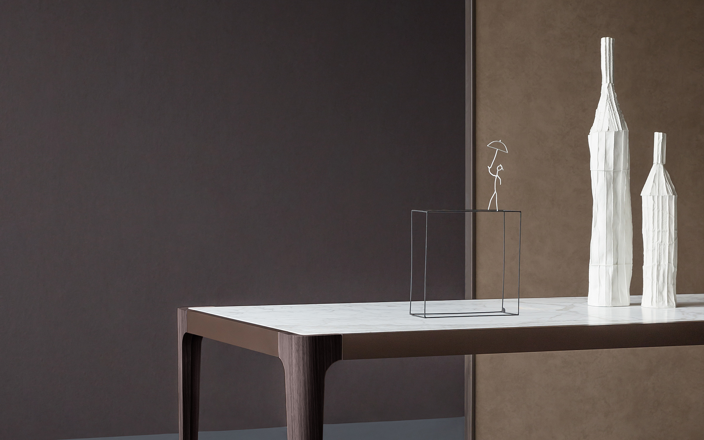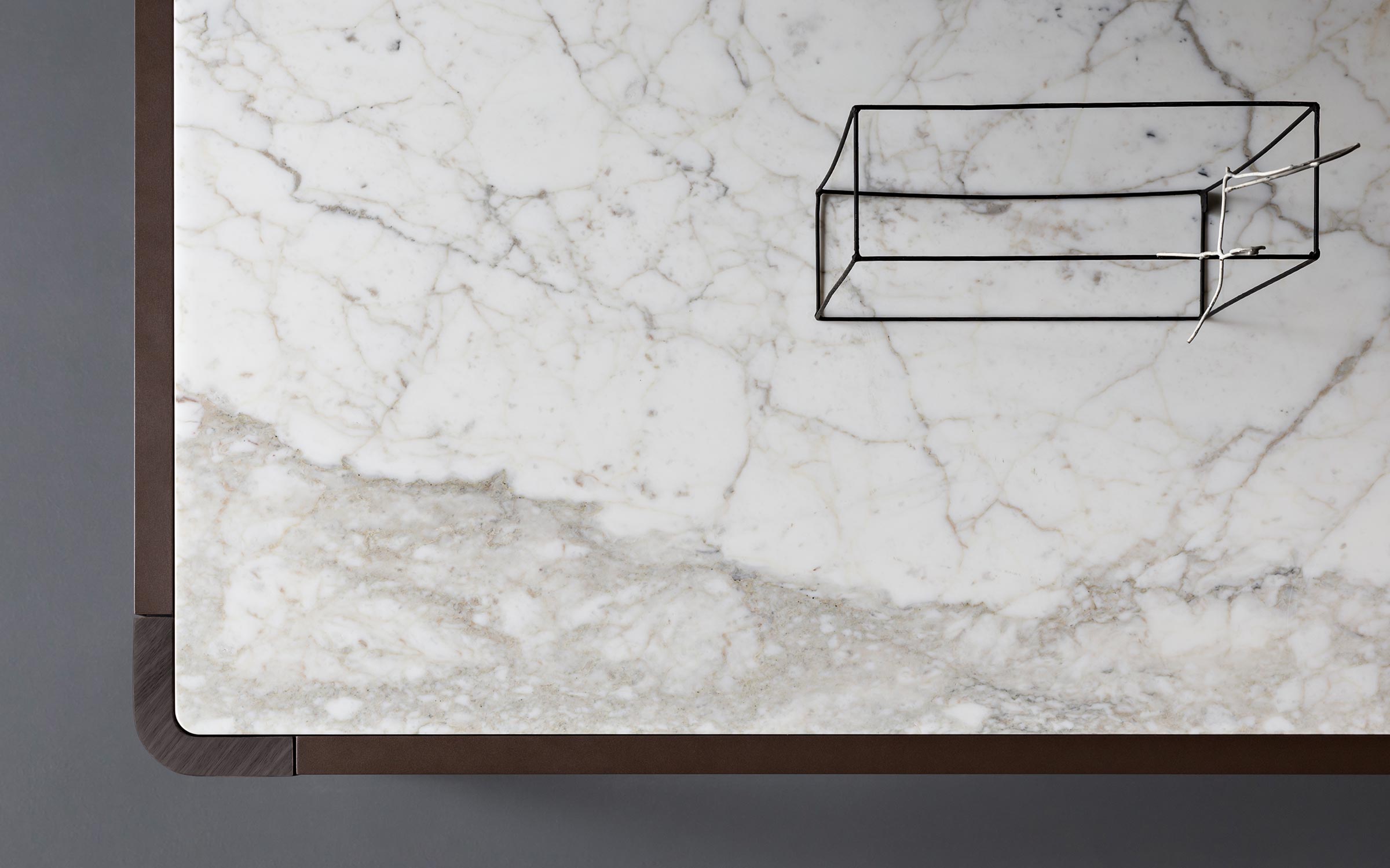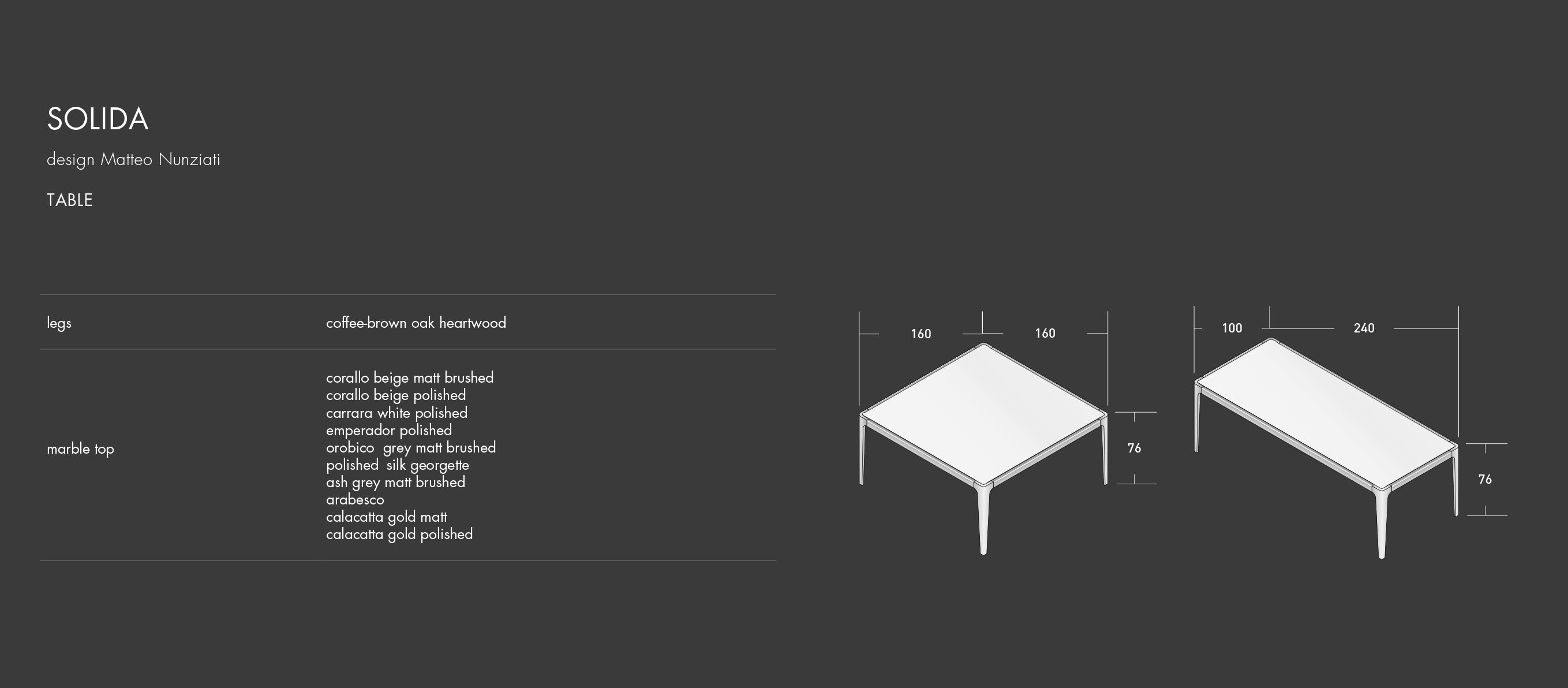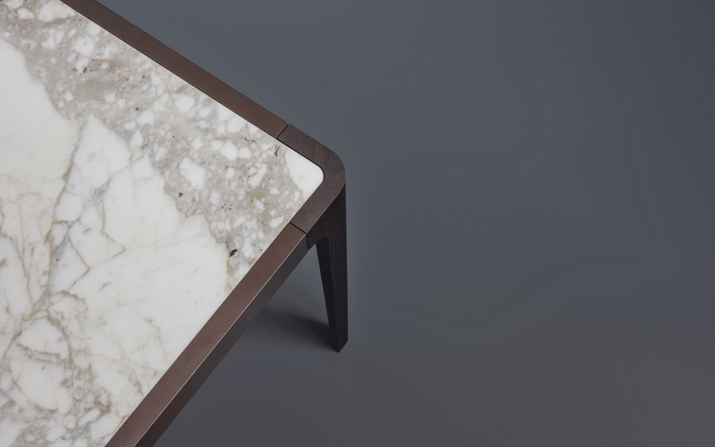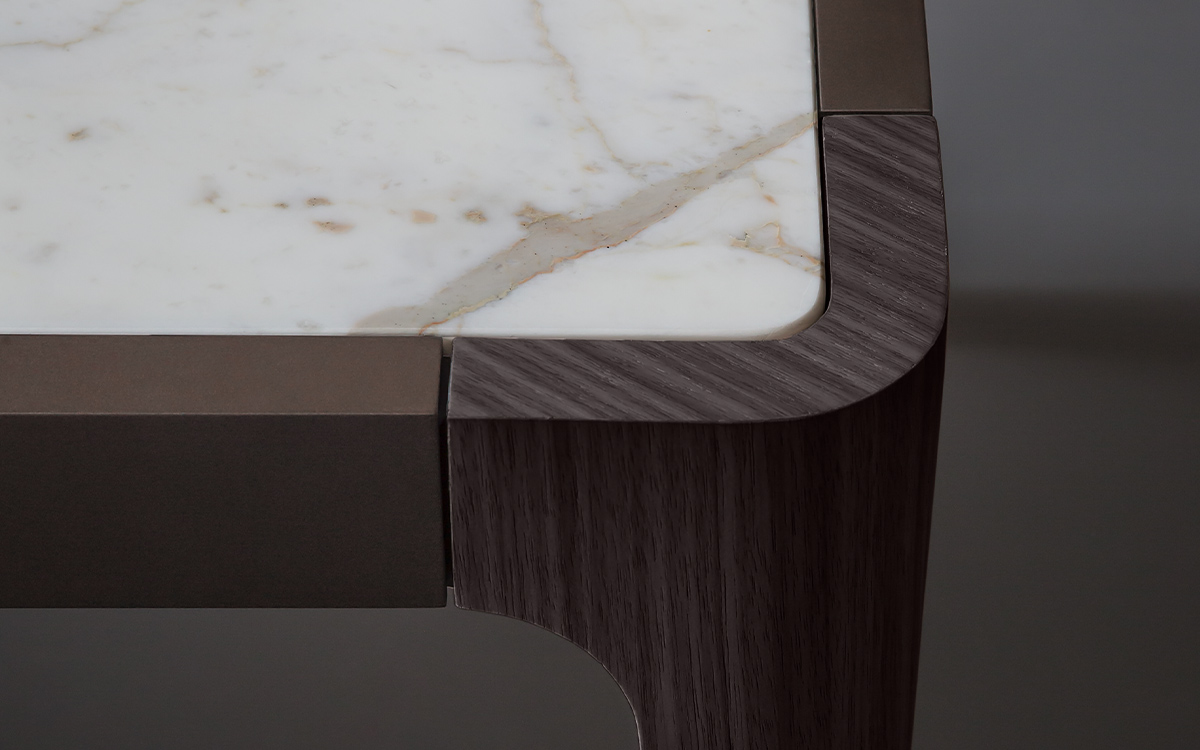 Square or rectangular tops are available, the legs have been made from coffee-brown oak heartwood, the edge trim is bronzed metal and a selection of marble tops are available.