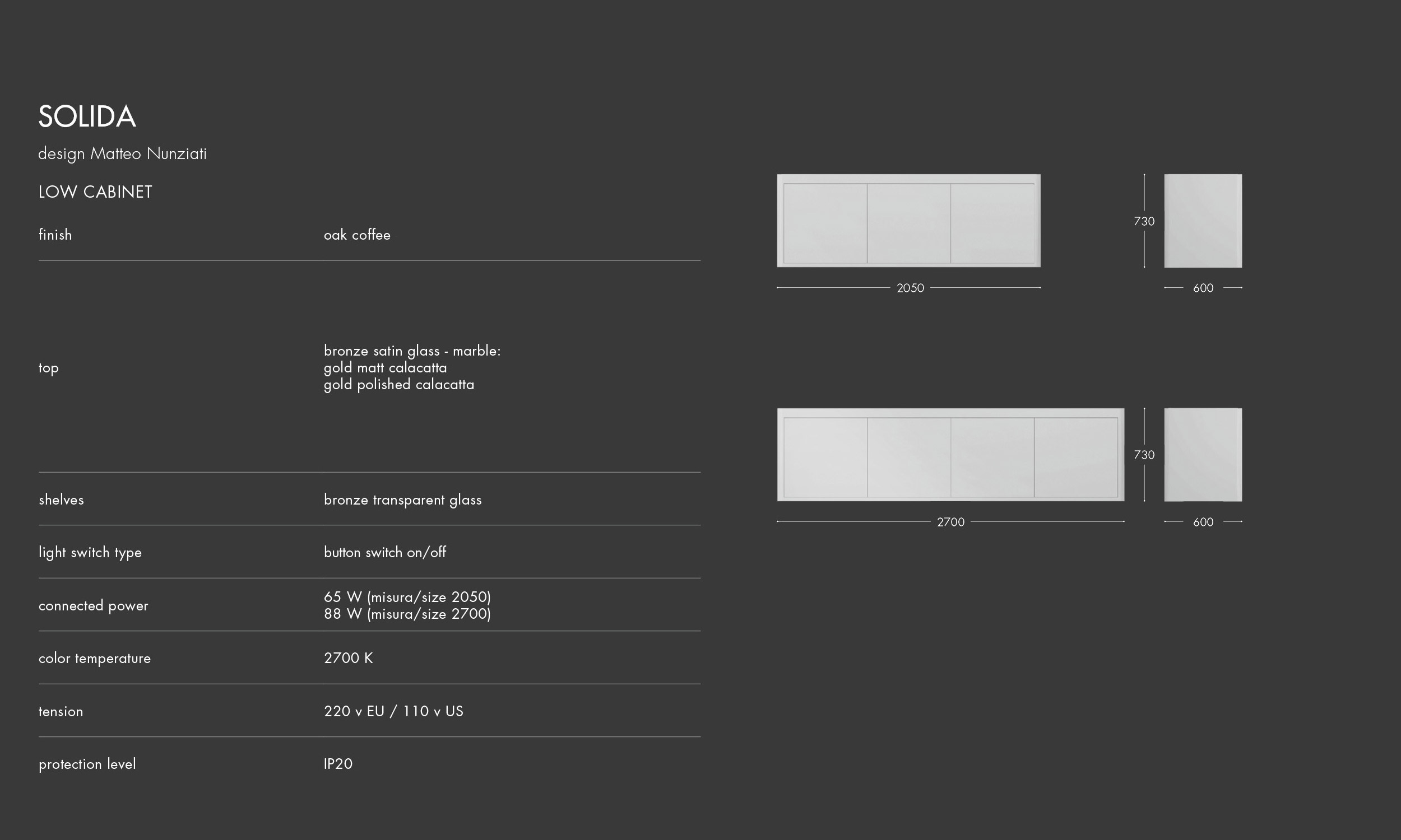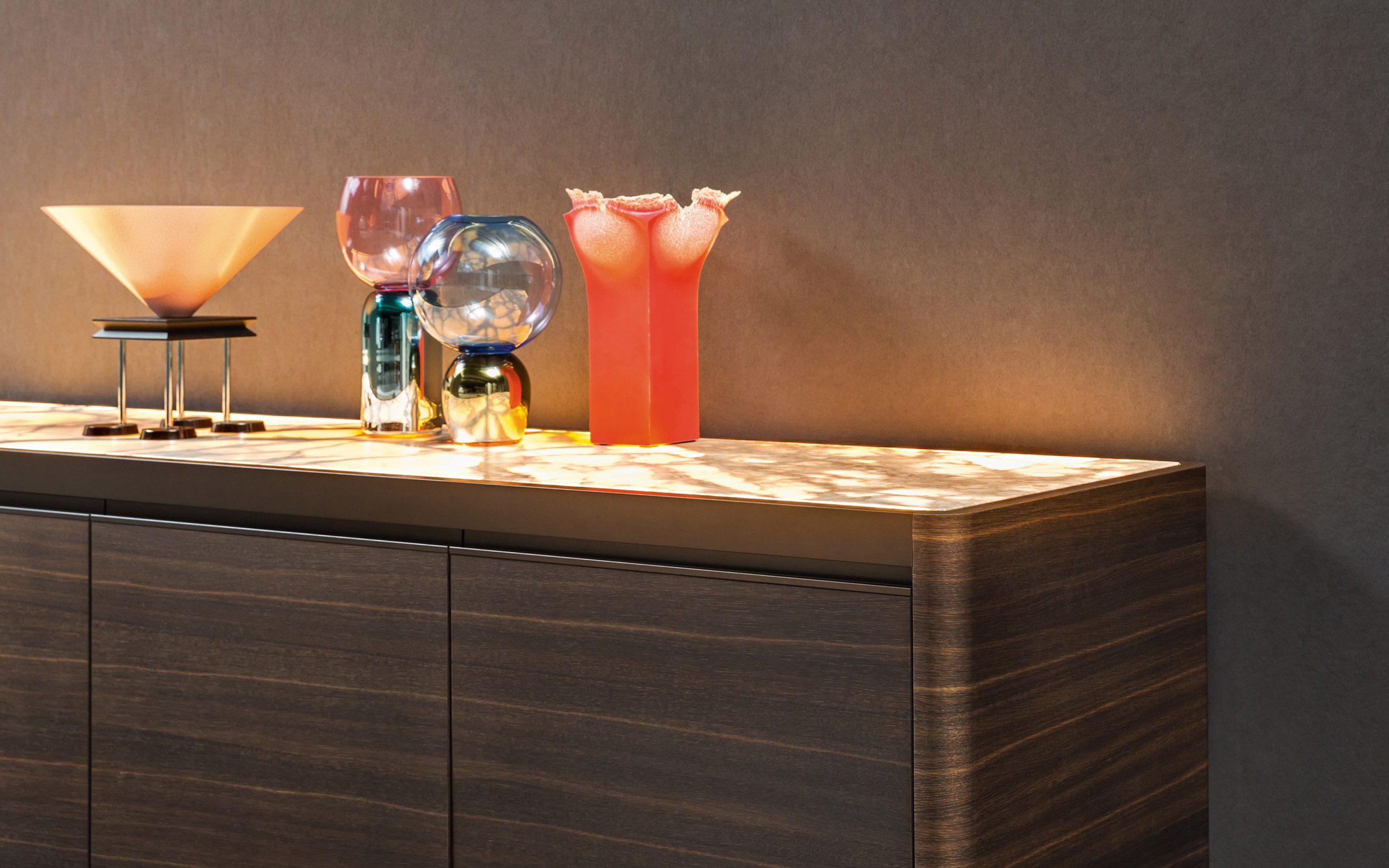 The coffee-brown oakwood structure supports a top available in four luxurious finishes: matt or polished gold Calacatta marble, bronzed or brushed glass. The internal compartments are fitted with clear bronzed glass shelves with doors fitted with elegant bronzed handles. When the doors are opened, the sensors automatically activate the lights fitted inside.