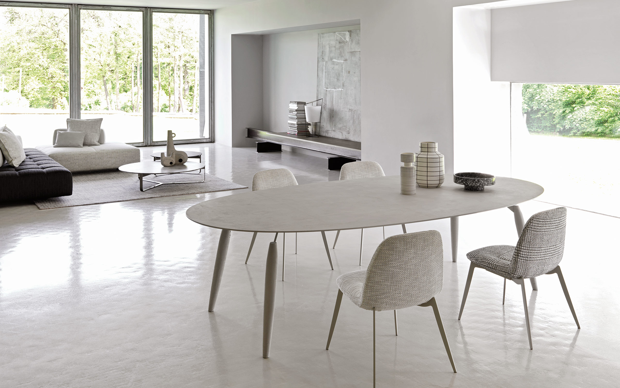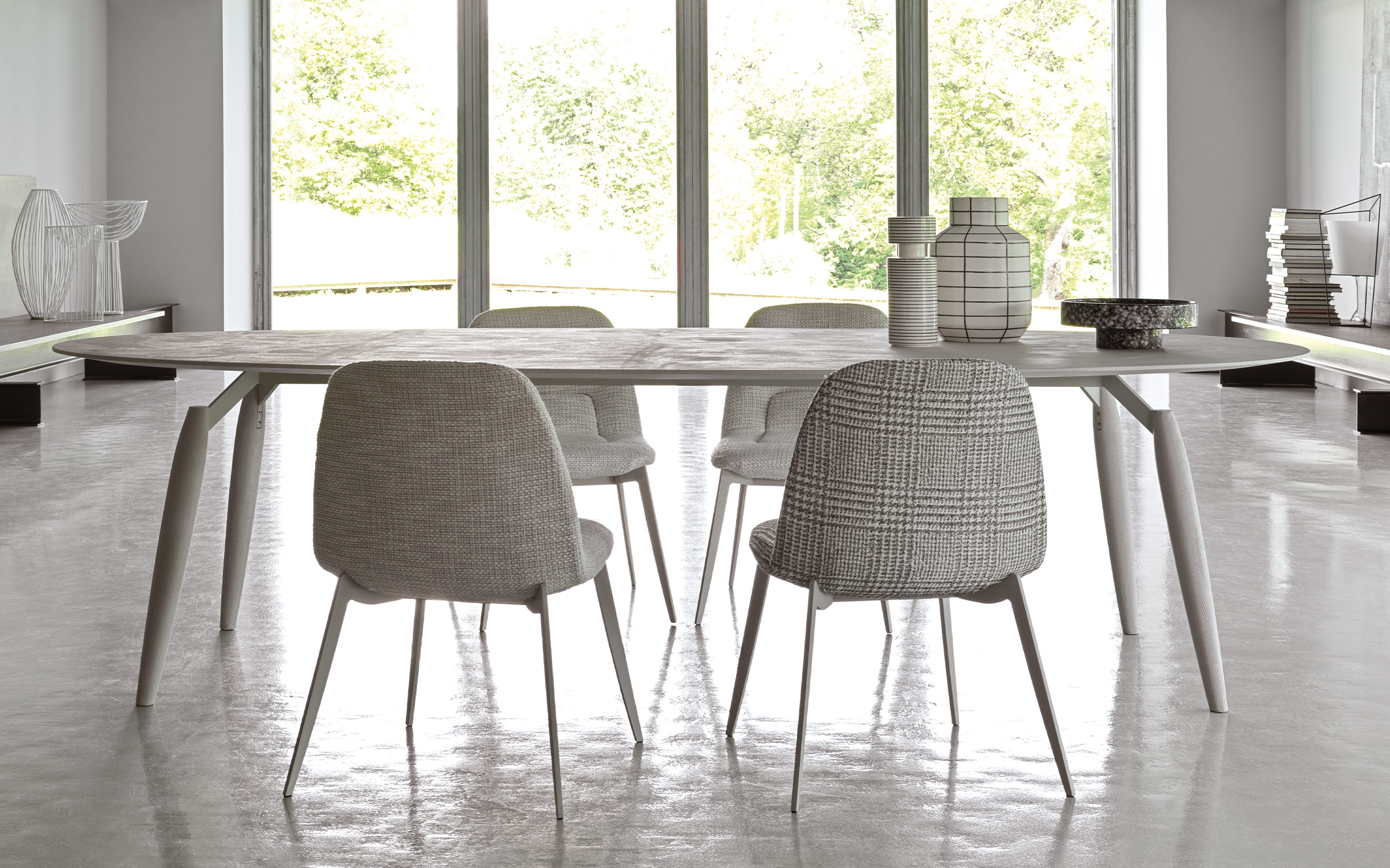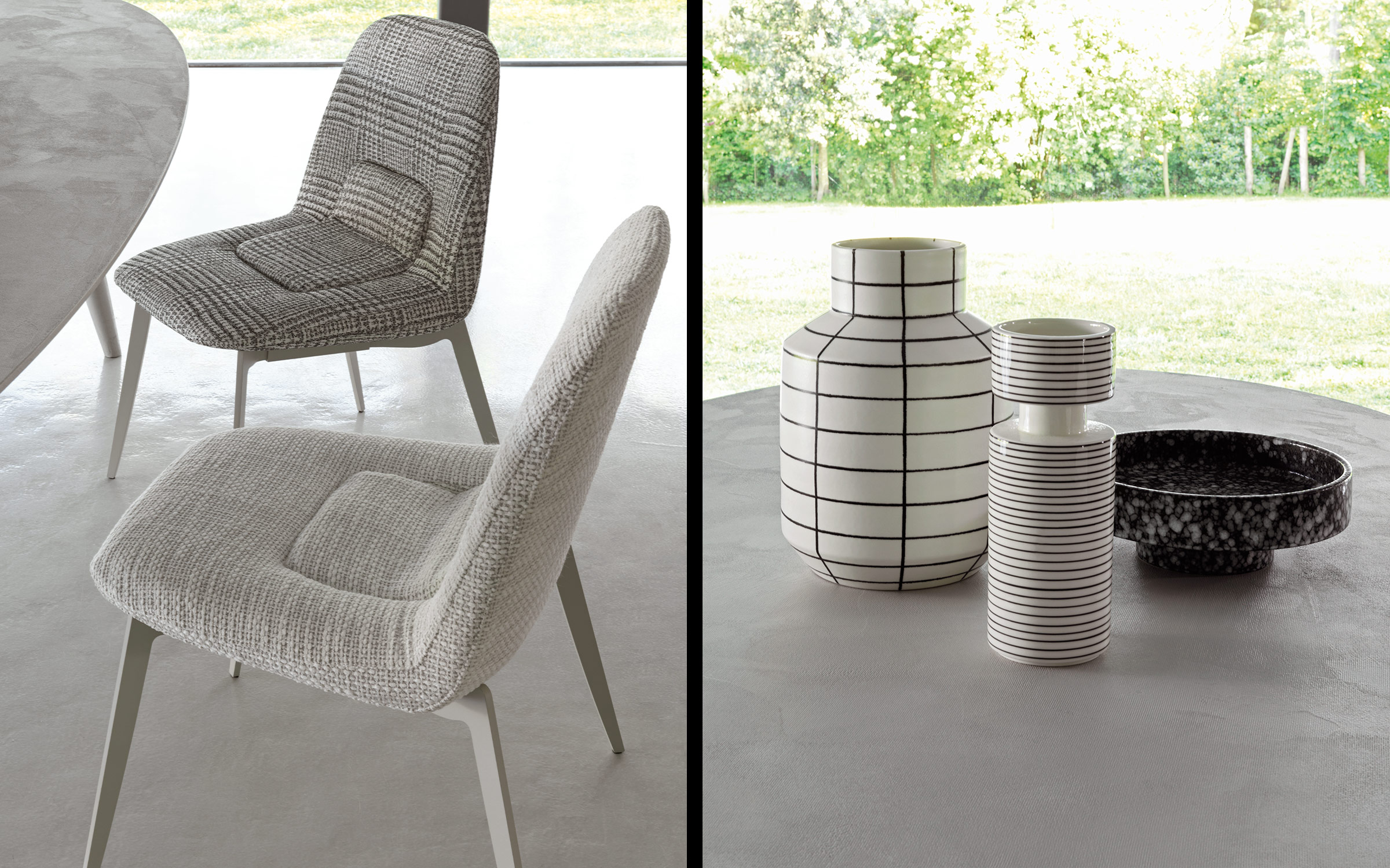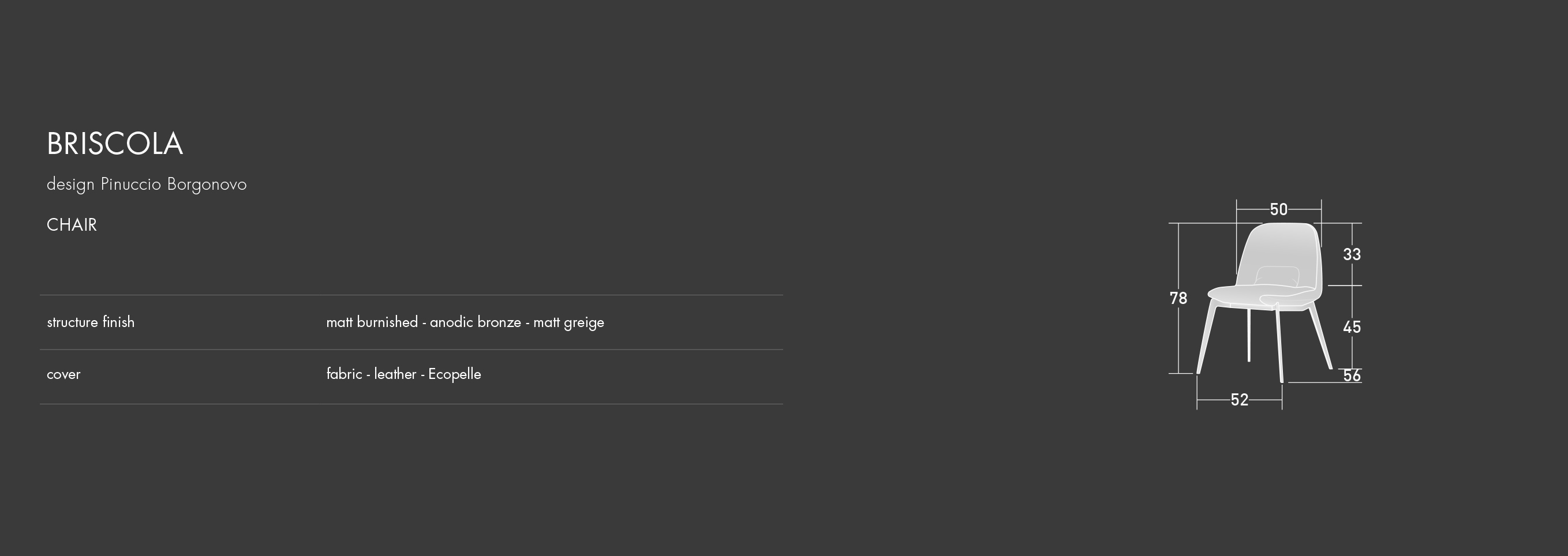 This chair is named after a popular Italian card game - Briscola. It is the perfect addition for every type of table and transmits an immediate sensation of comfort. The rounded shape contrasts sharply with the tailoring of the covers, creating an image that was clearly inspired by the world of automobiles. The severe metal structure (available in a matt burnished, anodic bronze or matt greige finish) is softened by the fabric or leather covers.