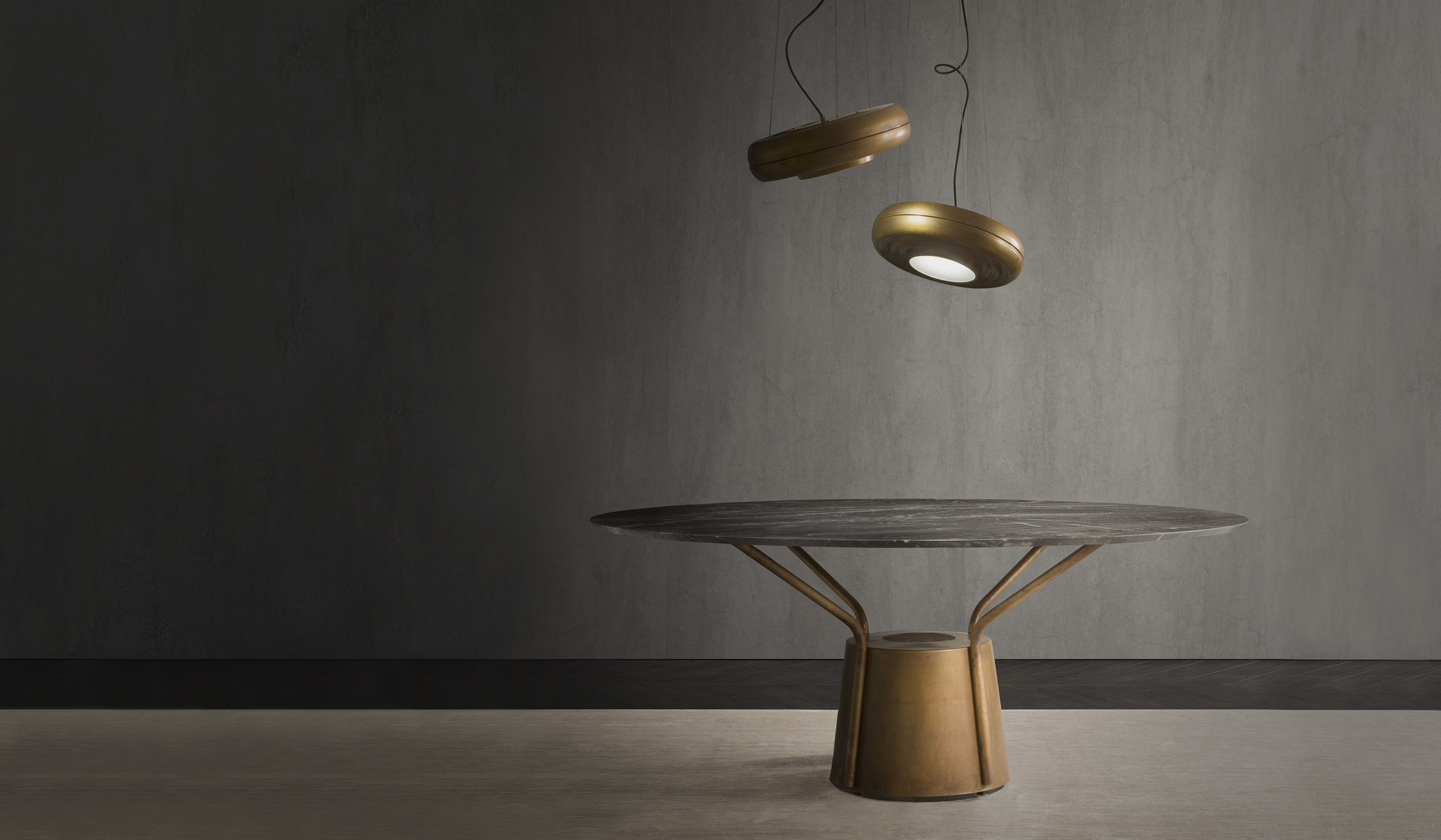 Inspired by a hot-air balloon, the table Balloon is characterised by its unique structure and the original base in anodic bronze. The round marble top is available in two measurements. The finish can be selected from the Flou marble collections.