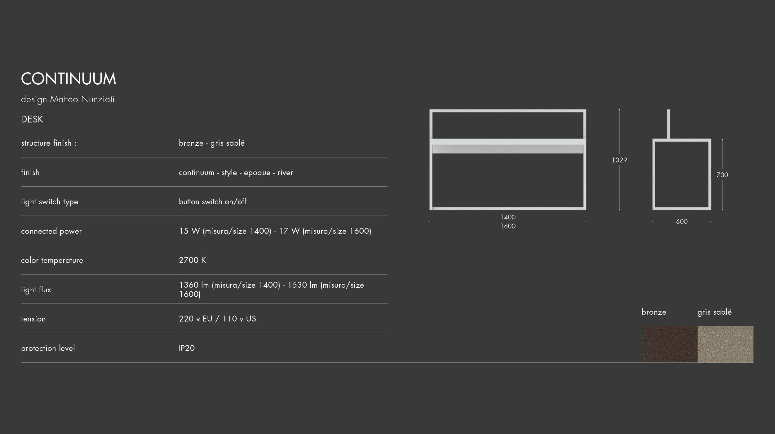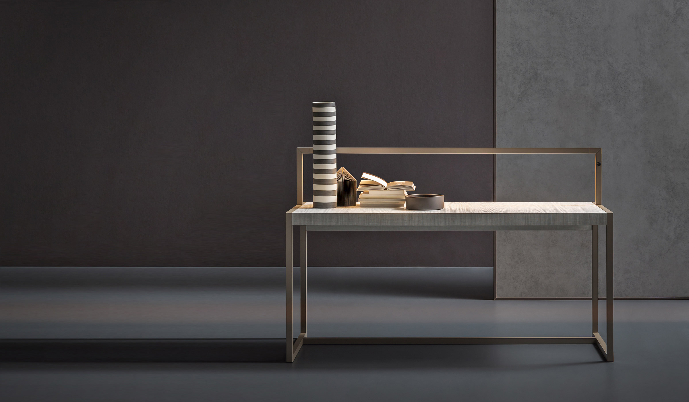 It can be used as a writing desk or a worktop ideal for the home office, studios or other professional facilities. The structure is available with an anodic bronze or gris sablè finish. The top is available in two wood finishes (coffee-brown oak or Canaletto Rialto walnut), or a special scratch-resistant, heat-structured finish (Style, Epoque or River). The LEDs are incorporated in the bar that can be manually adjusted to project the desired lighting onto the worktop.
