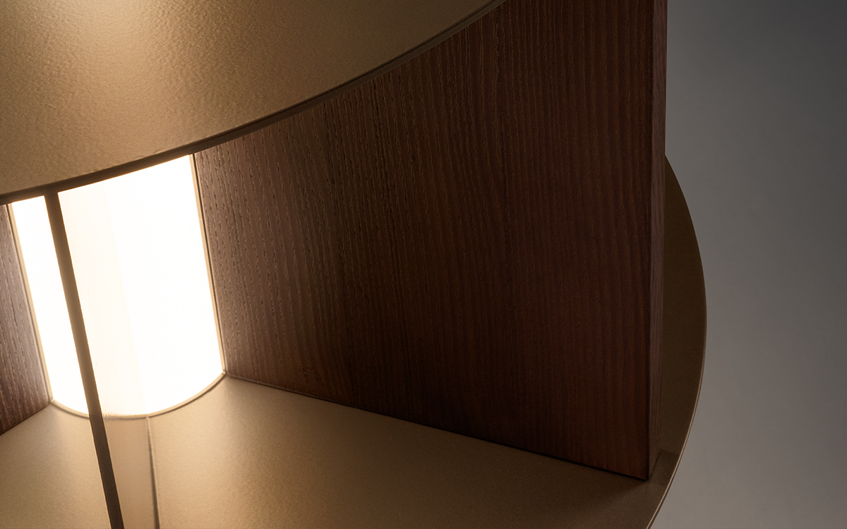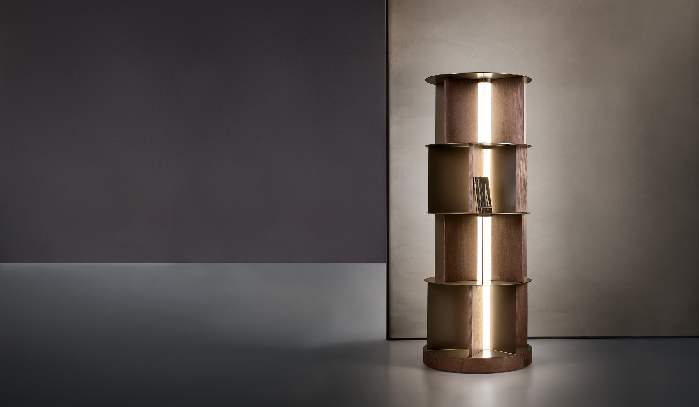 The LED lights are incorporated in the central column of the bookcase which also acts as the axis of rotation. Four horizontal shelves with vertical dividers of differing heights and depths are attached to the central column and have been carefully designed for storing books and displaying ornaments.