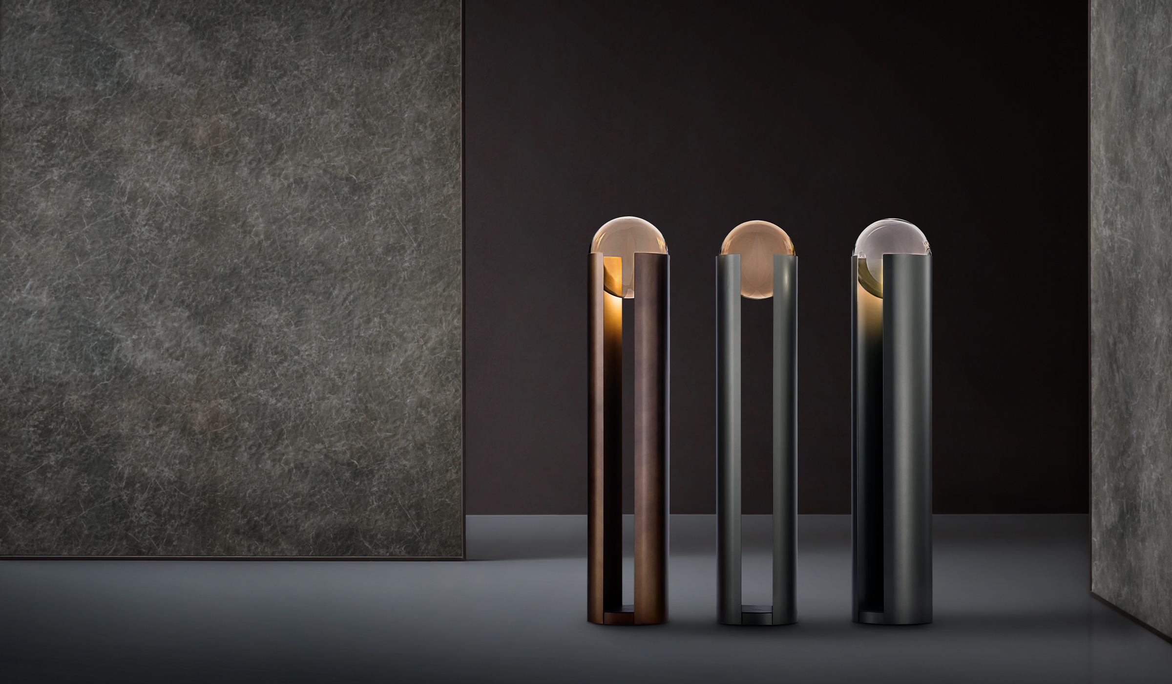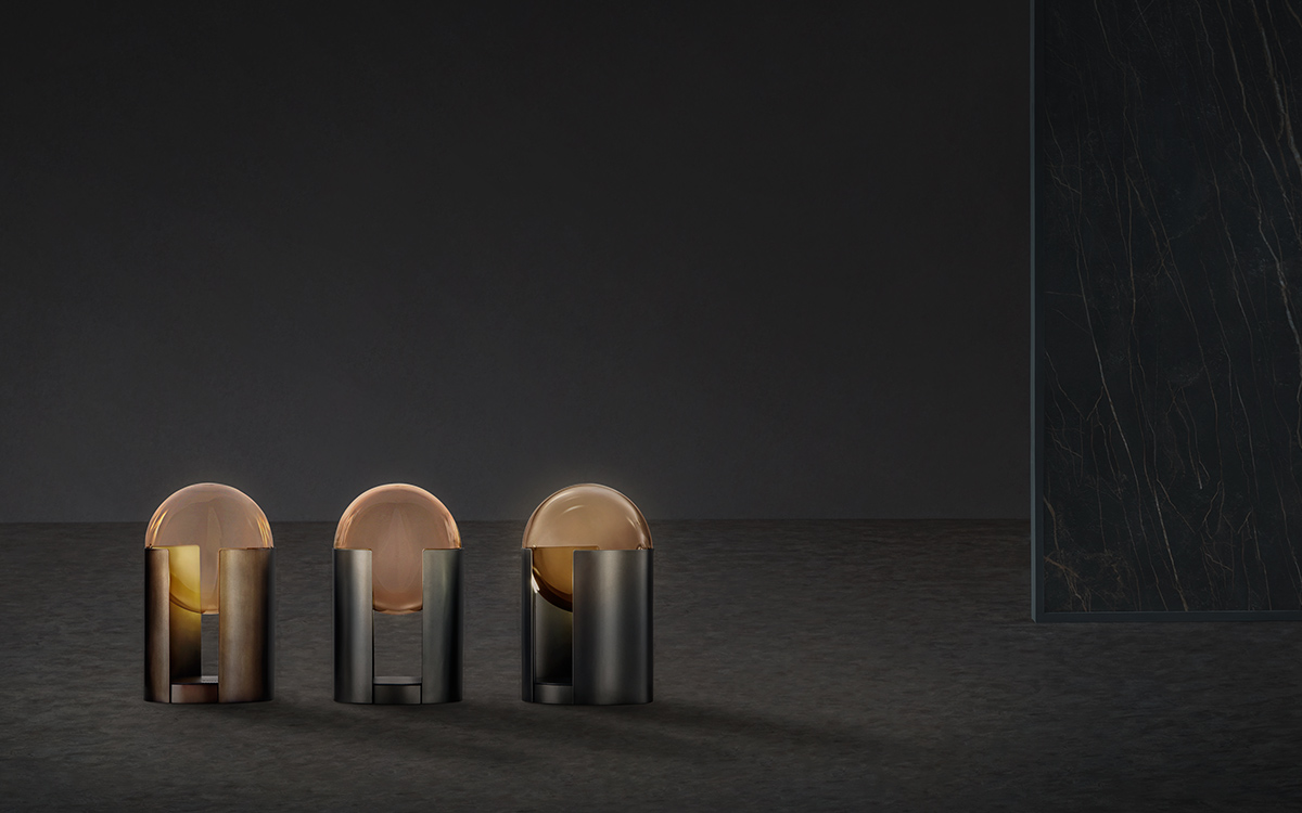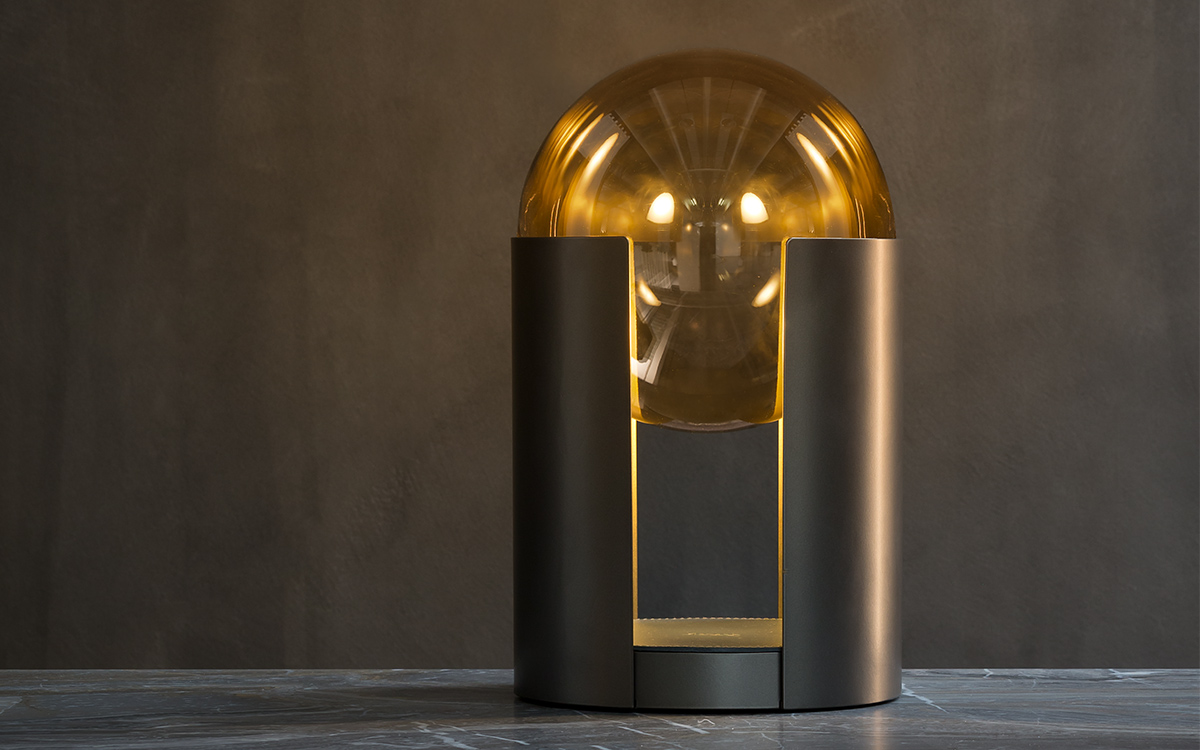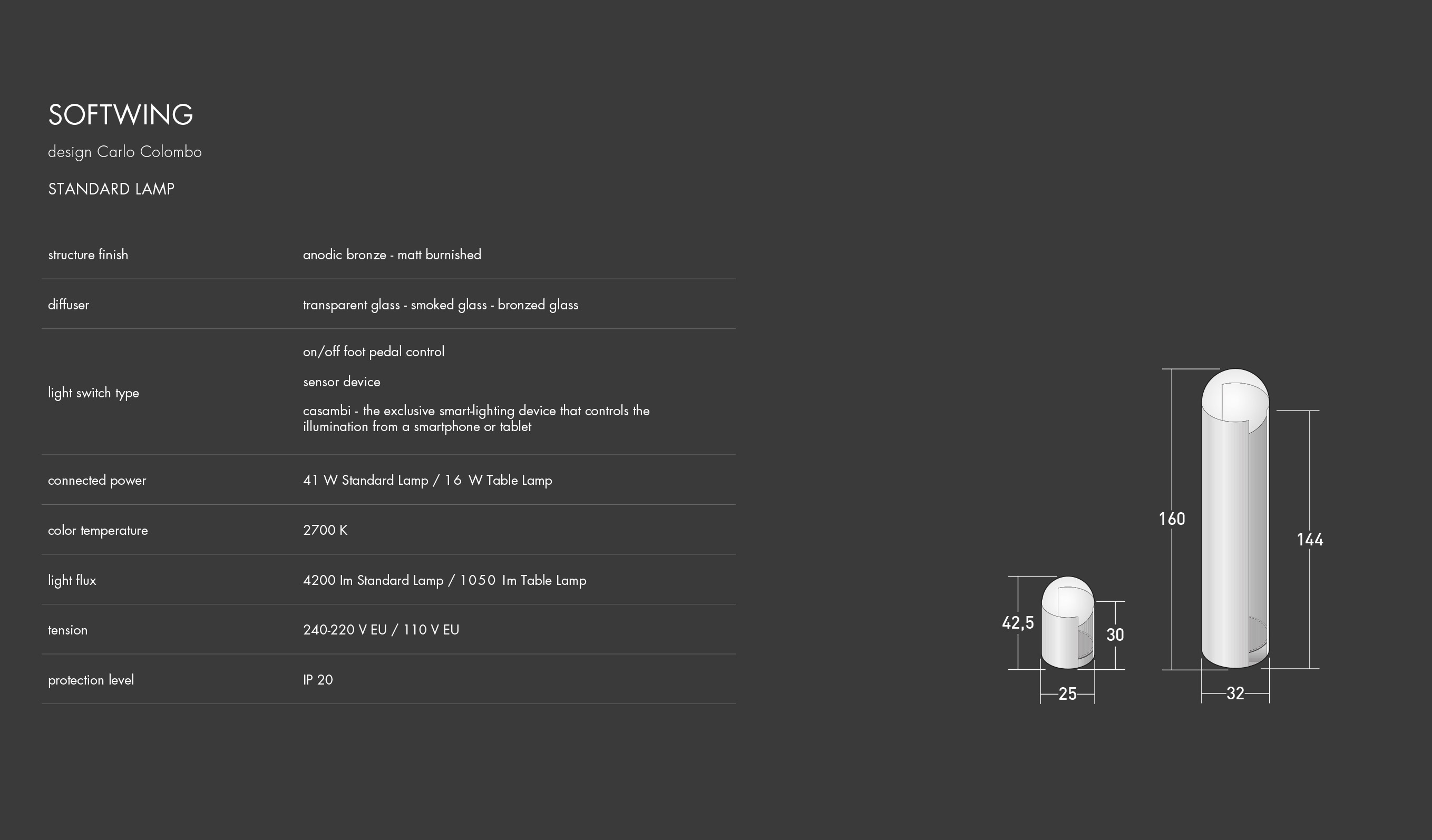 A functional, almost magical detail characterises the lamp Softwing: thanks to a sensor the lamp is activated with a light touch of the hand. Both the standard and table lamp versions are elegant and sophisticated, and produced exclusively with top quality materials: steel for the two support elements (with a choice of matt burnished or anodic bronze finish), blown glass for the luminous ball (with a choice of clear, smoked or bronze glass), hide for the disk that covers the base.