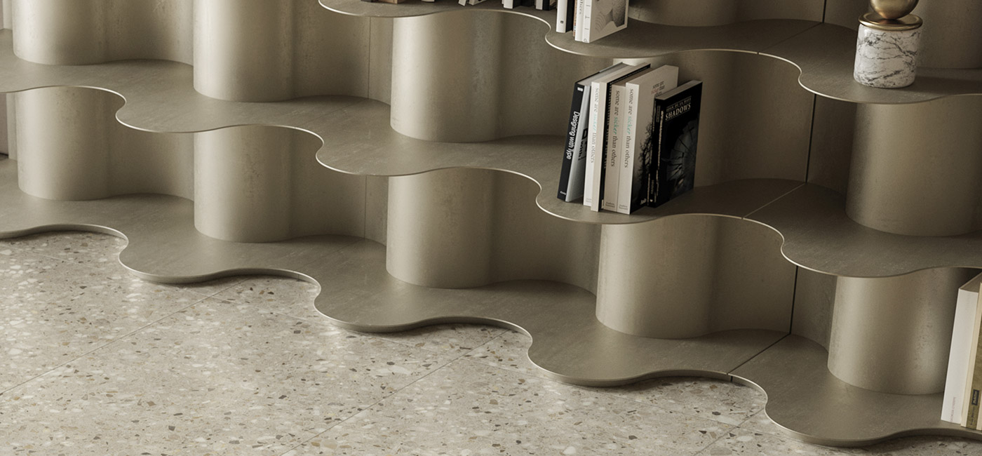 擱板造型與潮起潮落相呼應(yīng),在房間內(nèi)形成完美的流動造型。這些組件有兩種尺寸可供選擇,可以自由組合。