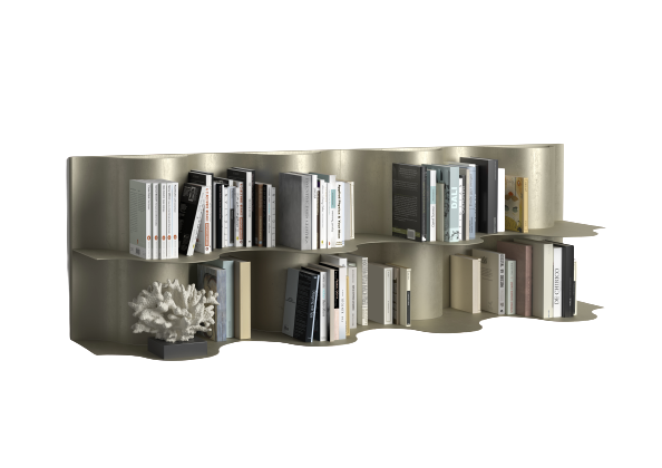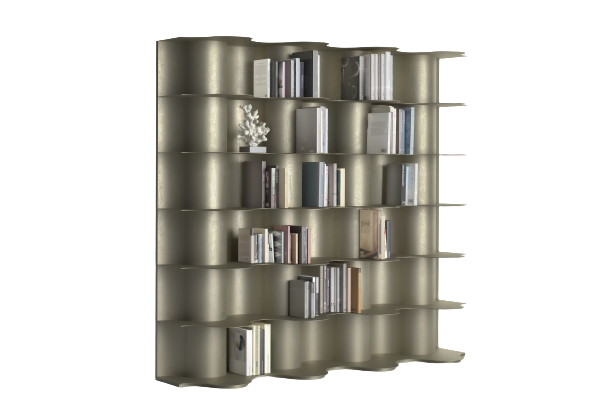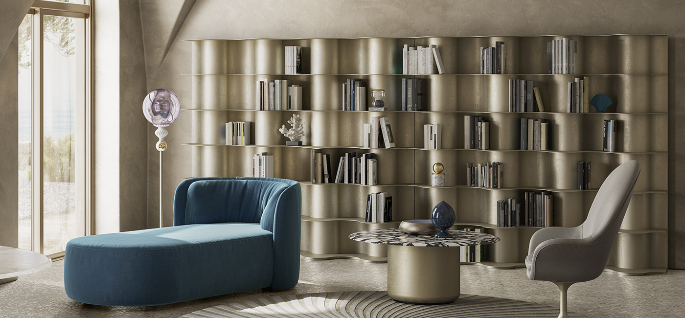 組裝家具的曲線線條,粉末涂飾的淺金色金屬,進一步凸顯出生活區(qū):Tide書架。