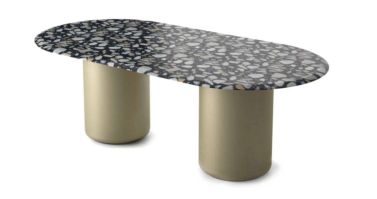 Voyage是一款造型蜿蜒的雕塑桌。有橢圓形和圓形兩種版本可供選擇,其特點是有兩個金屬包覆的淺金色啞光金屬單體基座。