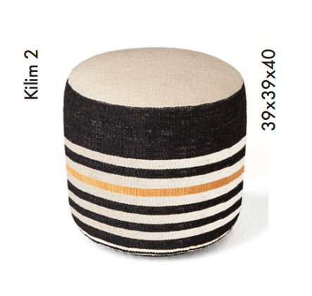 Aiming to transfer the warmth of the rug to other decorative elements has led to the creation of cylindrical poufs filled with flame-retardant padding inside a birch base, fully upholstered with geometric Kilims.