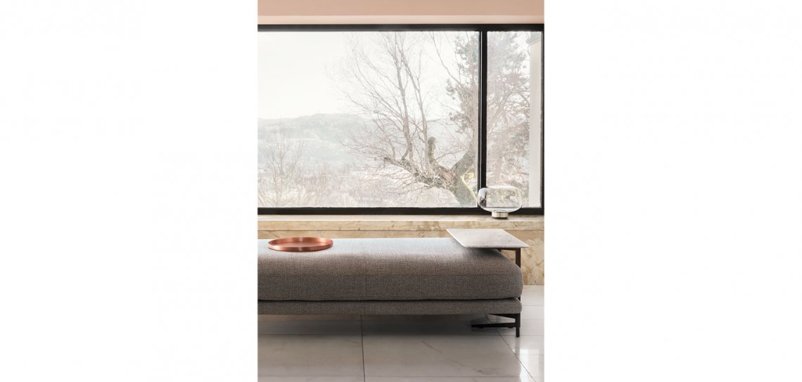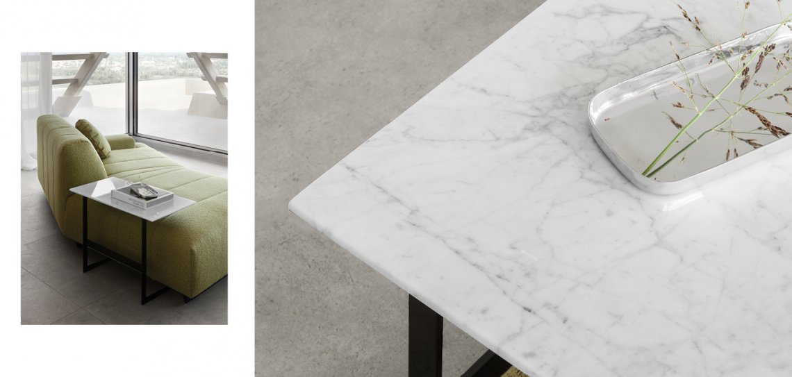 Il tavolino Plane fonde il calore del legno in finitura noce Canaletto al rigore del metallo. Adatto a completare particolari composizioni di divani Nicoline.