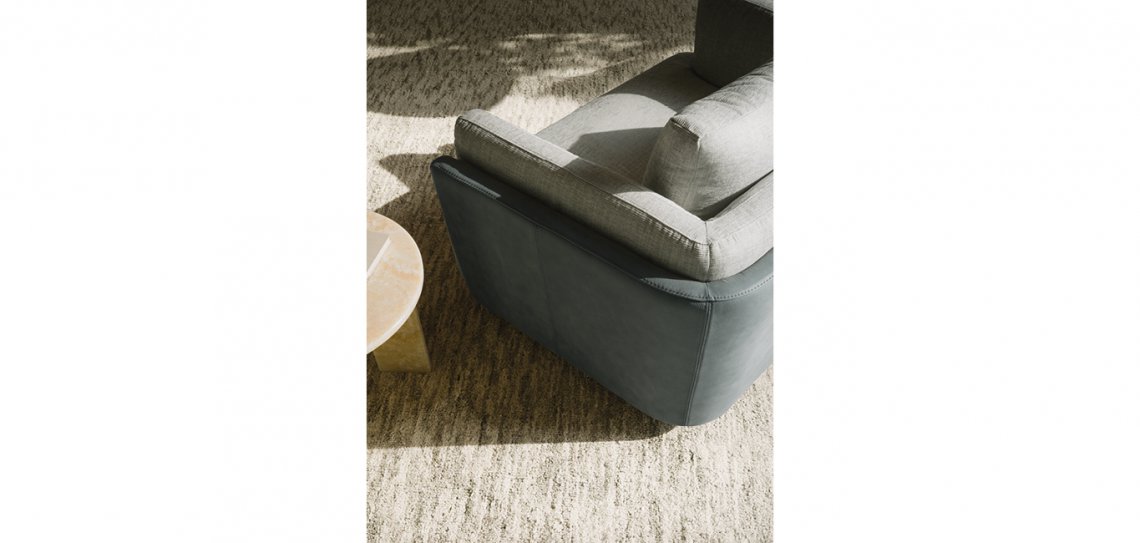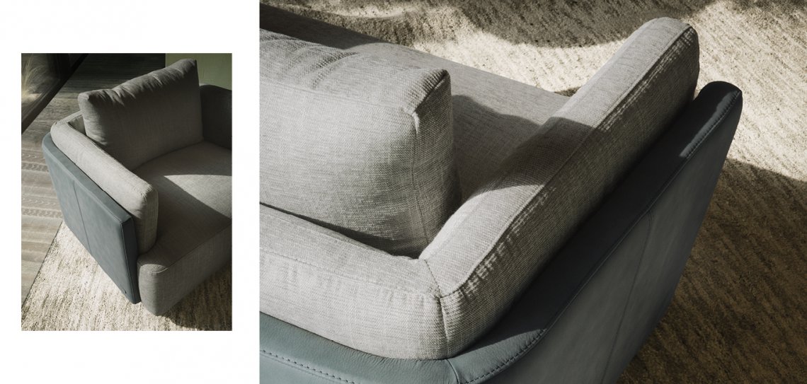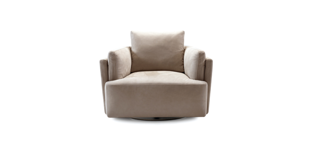 La poltrona Sunset Swivel ha una base circolare che permette una rotazione della poltrona di 360° e una seduta dall’apparente semplicità formale data dall’essenzialità del disegno, ma capace di offrire un comfort avvolgente grazie alle proporzioni generose.