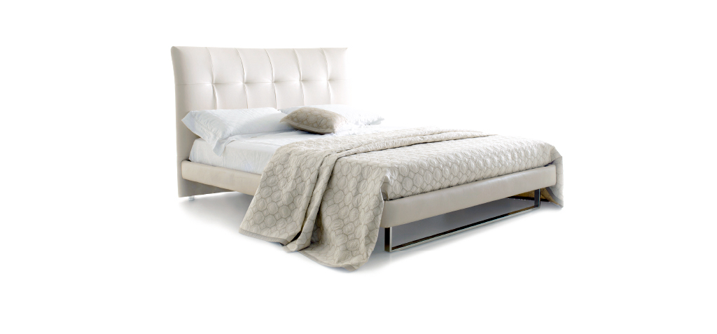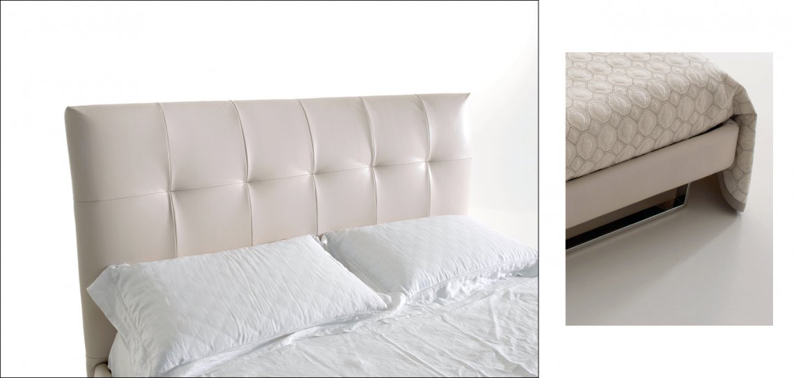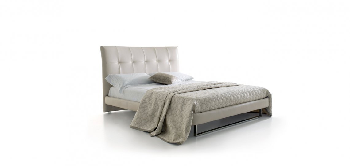 Letto Bloom dalle linee nette e pulite, sorprendentemente classico. La testata è ampia e accogliente, impreziosita da una delicata lavorazione a impunture regolari, a formare un moderno capitonné. Un perfetto mix di comfort ed eleganza di altri tempi