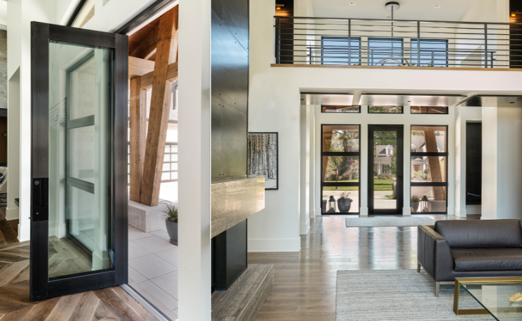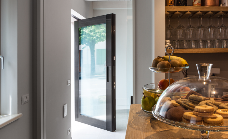Porta blindata a bilico vetrata che permette di creare ingressi di qualsiasi dimensione.Nova è la porta a bilico vetrata che consente nuove possibilità progettuali nello spazio dell’ingresso: il dialogo serrato tra interno ed esterno continua, rivolgendo lo sguardo oltre la soglia e portandoci il paesaggio dentro.