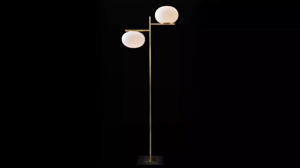 Two floor-standing versions complete the project: in both versions, a large rectangular-section stem with a satin brass finish and anodic bronze finish arises from an anthracite base. In the first version, an arm branches off from the top, with a sphere suspended underneath it, while in the second, two arms of different heights, on each side, support the luminous drops, one from above and the other from below.