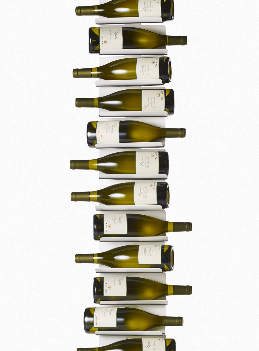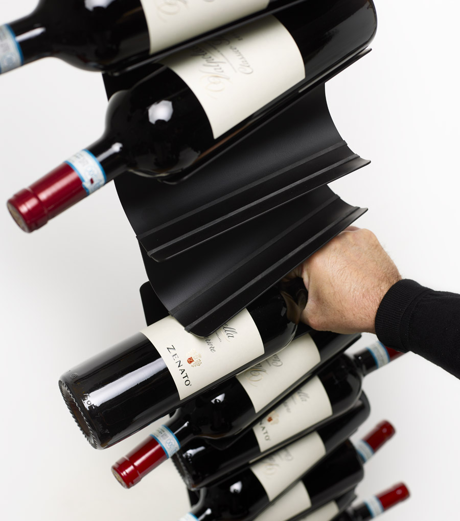 Nata dai disegni lasciati da Bruno Rainaldi, Ptolomeo Vino è una colonna in metallo a cui viene unito un sistema di alloggiamenti atti a contenere le più svariate tipologie di bottiglie di vino. I sostegni sono stati studiati per risultare quanto più possibile impercettibili e dare quindi la sensazione di trovarsi di fronte a bottiglie “sospese”.