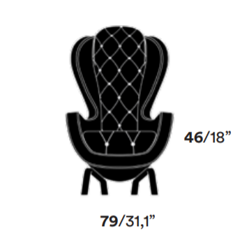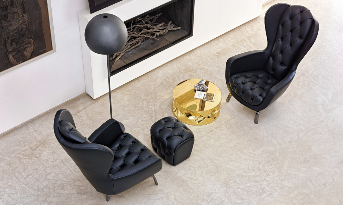 Come ogni altro pezzo della collezione di quell’anno, anche la bergère trova nel Medioevo e nella rivisitazione dei concetti precostituiti i propri motivi ispiratori. Da un lato quindi il nome Guelfo, in omaggio ad una delle opposte fazioni che durante il Medioevo tanta parte ebbero nella costruzione della storia e nella cultura fiorentina, dall’altra, l’utilizzo – rivisitato con sofisticata ironia –  di elementi estetici di epoche trascorse, che qui vengono contaminati e attualizzati con dettagli squisitamente contemporanei. Un sapiente (e molto post-moderno) gioco di accostamenti inediti, come l’idea di impiegare assieme elementi e materiali in apparenza eterogenei, quali la lavorazione capitonné e il nichel nero utilizzato per la struttura.