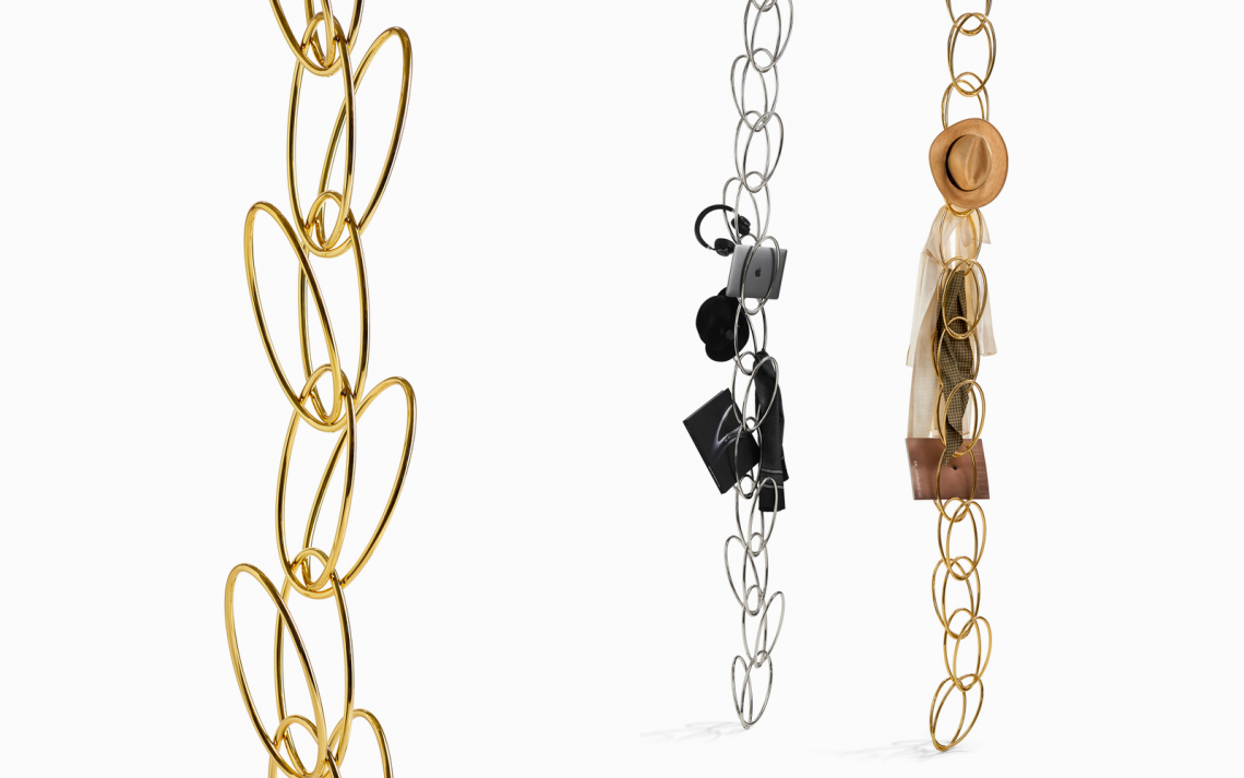 Senzatempo è un appendiabiti - ma anche un portaoggetti - composto da singoli anelli in acciaio che, piegandosi, assumono la forma di altrettanti anelli d’infinito, anelli che poi possono liberamente intrecciarsi, l’uno dentro l’altro, fino a dare vita a delle composizioni che variano a seconda della tipologia dell’ambiente. Disponibile in due versioni - da parete o da soffitto - è il complemento ideale per dare immediato carattere ad un ambiente. Grazie alle due finiture galvaniche – l’accattivante cromo o il più raffinato oro – e al poco ingombro, fa risplendere anche gli angoli più anonimi, a casa ma anche in ambito contract