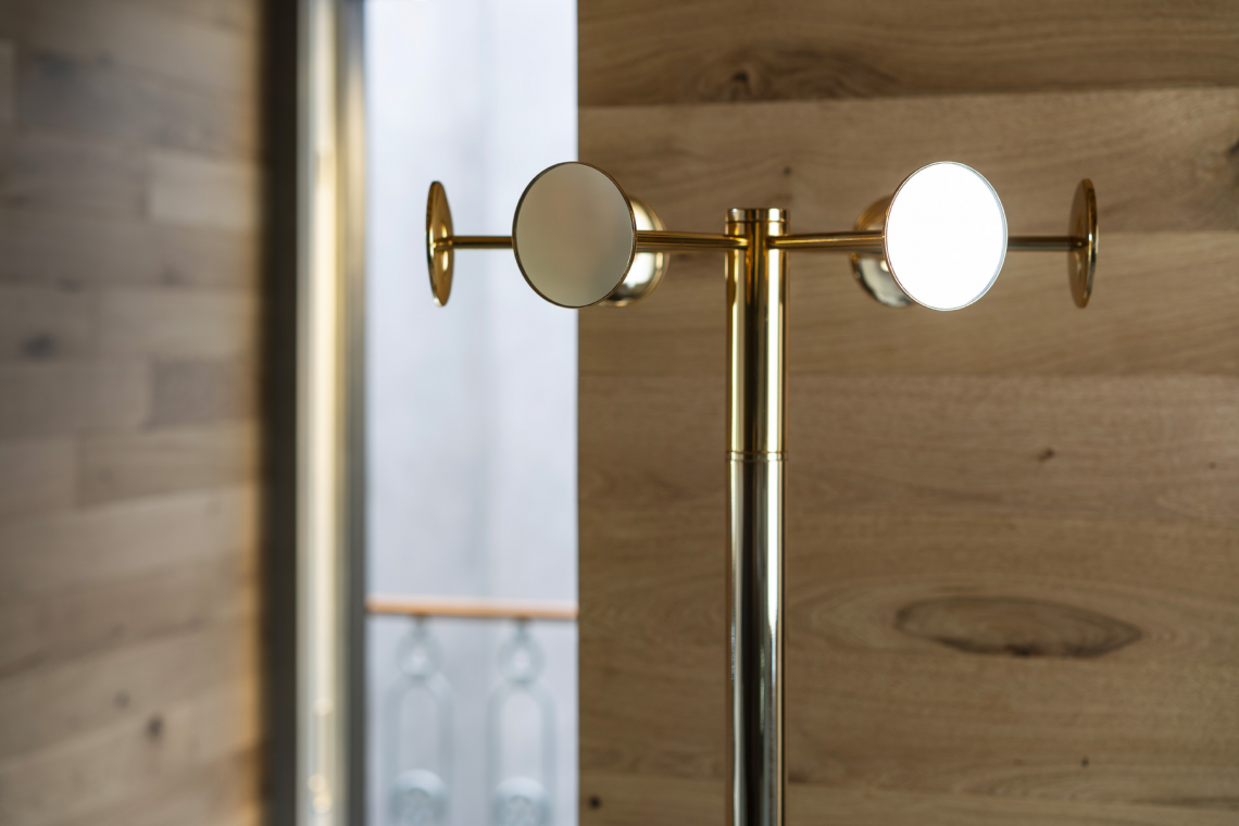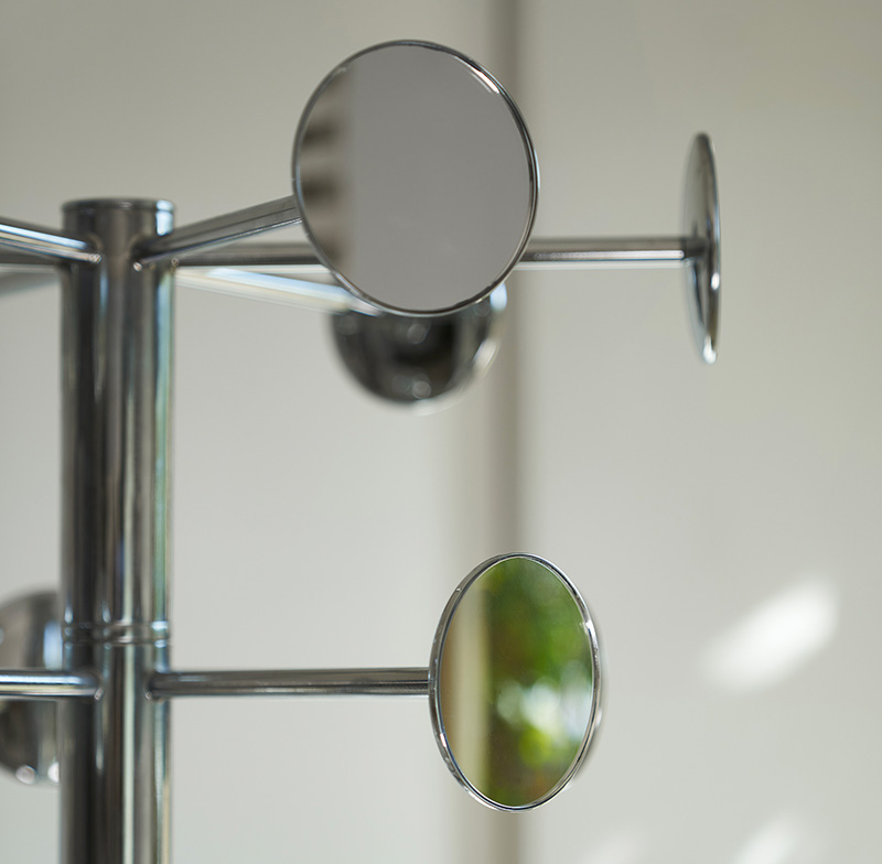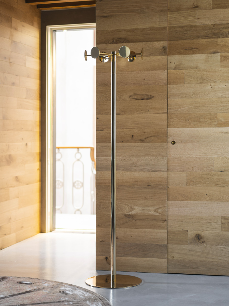 Prende il suo odierno significato dall’uso figurato della parola chaperon ?cappuccio?, diminutivo di chape ?cappa?, e si riferisce a chi soprattutto in contesti mondani introduce qualcun altro in un ambiente nuovo. E così fa Chaperon l’appendiabiti disegnato da Bruno Rainaldi, da un lato accoglie cappe, cappucci, cappotti mentre dall’altro introduce nel nuovo ambiente chi probabilmente dovendo ancora disfarsi degli abiti in sovrappiù è appena arrivato.