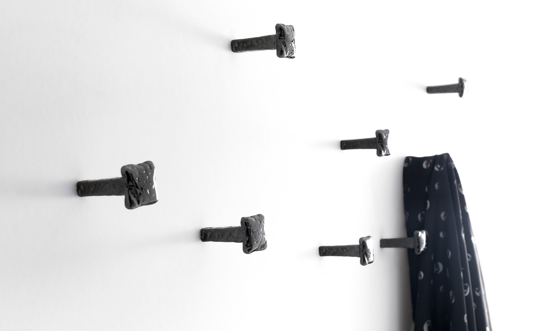 Chiodo Schiaccia Chiodo è più di un semplice chiodo, Chiodo Schiaccia Chiodo è una linea di appendiabiti da parete realizzati in fusione. Frutto dello spiccato spirito di osservazione di Bruno Rainaldi, Chiodo Schiaccia Chiodo è un oggetto di design ready made. Dalla caratteristica forma, questo speciale appendiabiti diventa vero e proprio elemento di arredo che coniuga carattere industriale a raffinate finiture lucide (cromo, oro 24 k e nichel nero). Estremamente versatile e facile da installare gioca un ruolo da protagonista in tutti gli ambienti, non più relegato al solo ingresso ma tratto distintivo della zona living, della camera da letto e perché no, del bagno. Con Chiodo Schiaccia Chiodo la forma diventa protagonista senza ostacolare la funzionalità dell'oggetto, una forma che invita a giocare con la fantasia per creare combinazioni fortemente personalizzate, a casa come in ambienti contract.
