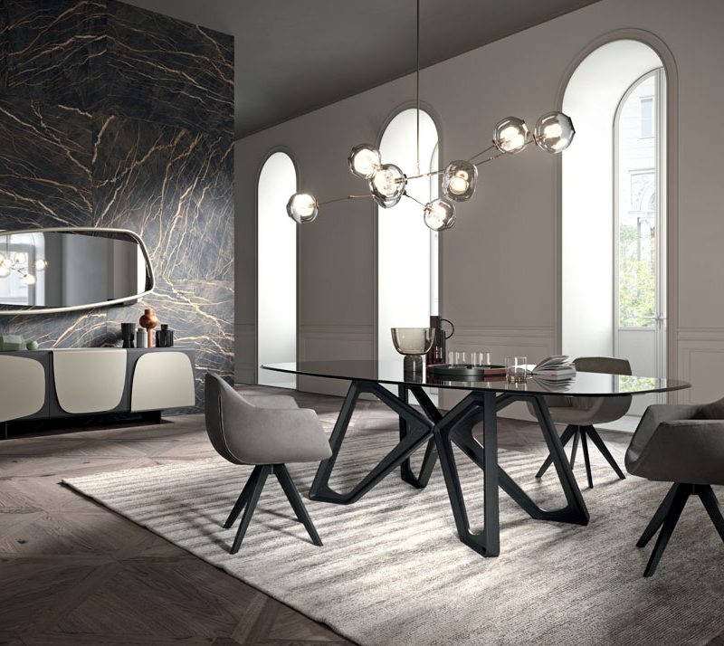 Tavolo da pranzo con base in legno massello, piano in cristallo 12 mm o in legno 28mm.