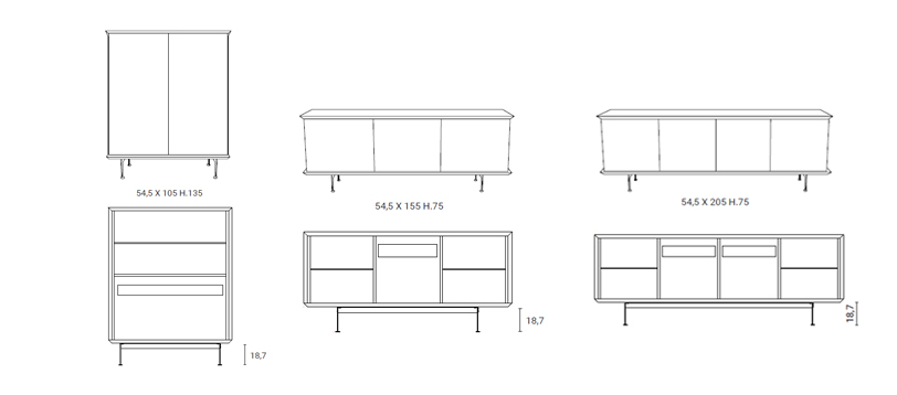 Famiglia di madie con contenitore in laccato. Ante e fianchi in essenza o laccato. Ripiani interni in cristallo e cassetti in tinta con top e cornice. Piedini in metallo verniciato. Mensola in legno nella versione due ante.