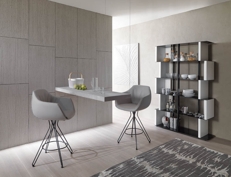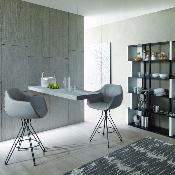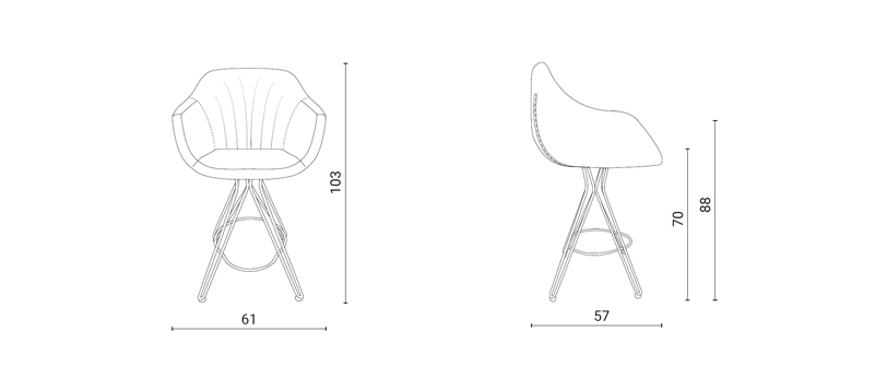 Sgabello fisso con basamento in filo metallico e seduta rivestita in pelle o velvet.