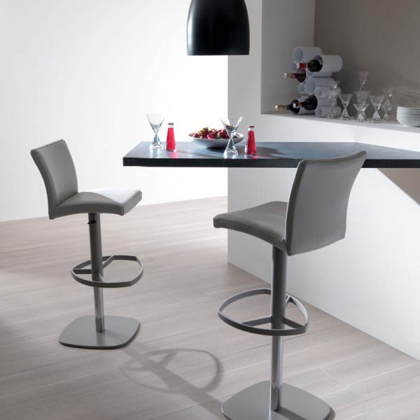 Sgabello con alzata a gas, basamento in metallo e seduta rivestita in pelle o o eco pelle nabuk.