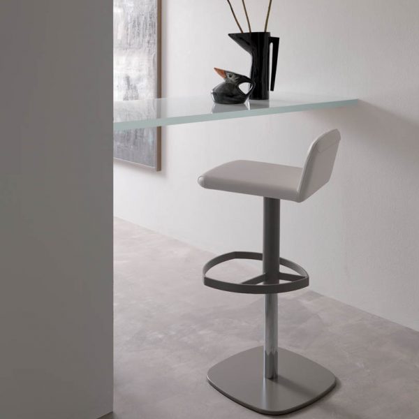 Sgabello con alzata a gas, basamento in metallo e seduta rivestita in pelle.