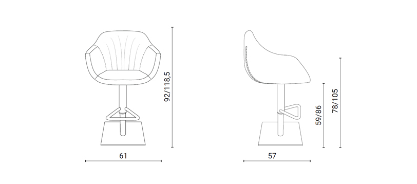 Sgabello con alzata a gas, basamento in metallo e seduta rivestita in pelle, eco pelle nabuk o velvet.