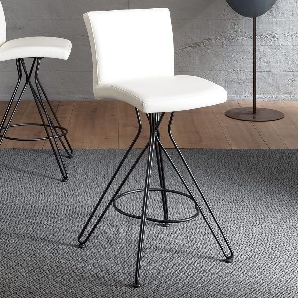 Sgabello fisso con basamento in filo metallico e seduta rivestita in pelle o eco pelle nabuk.