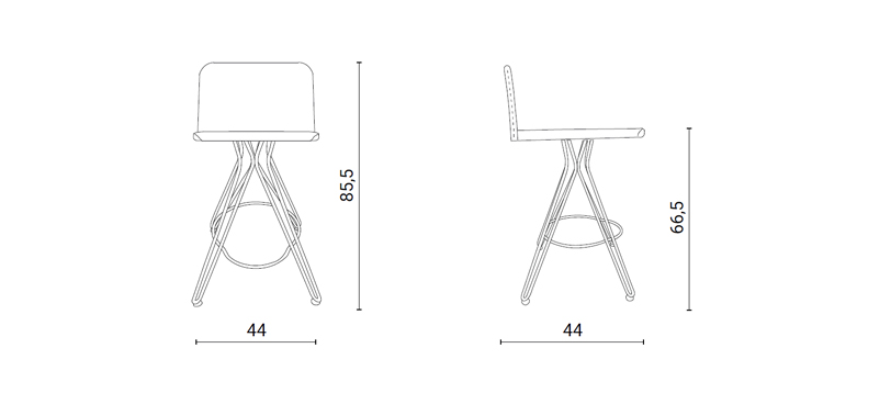 Sgabello fisso con basamento in filo metallico e seduta rivestita in pelle.