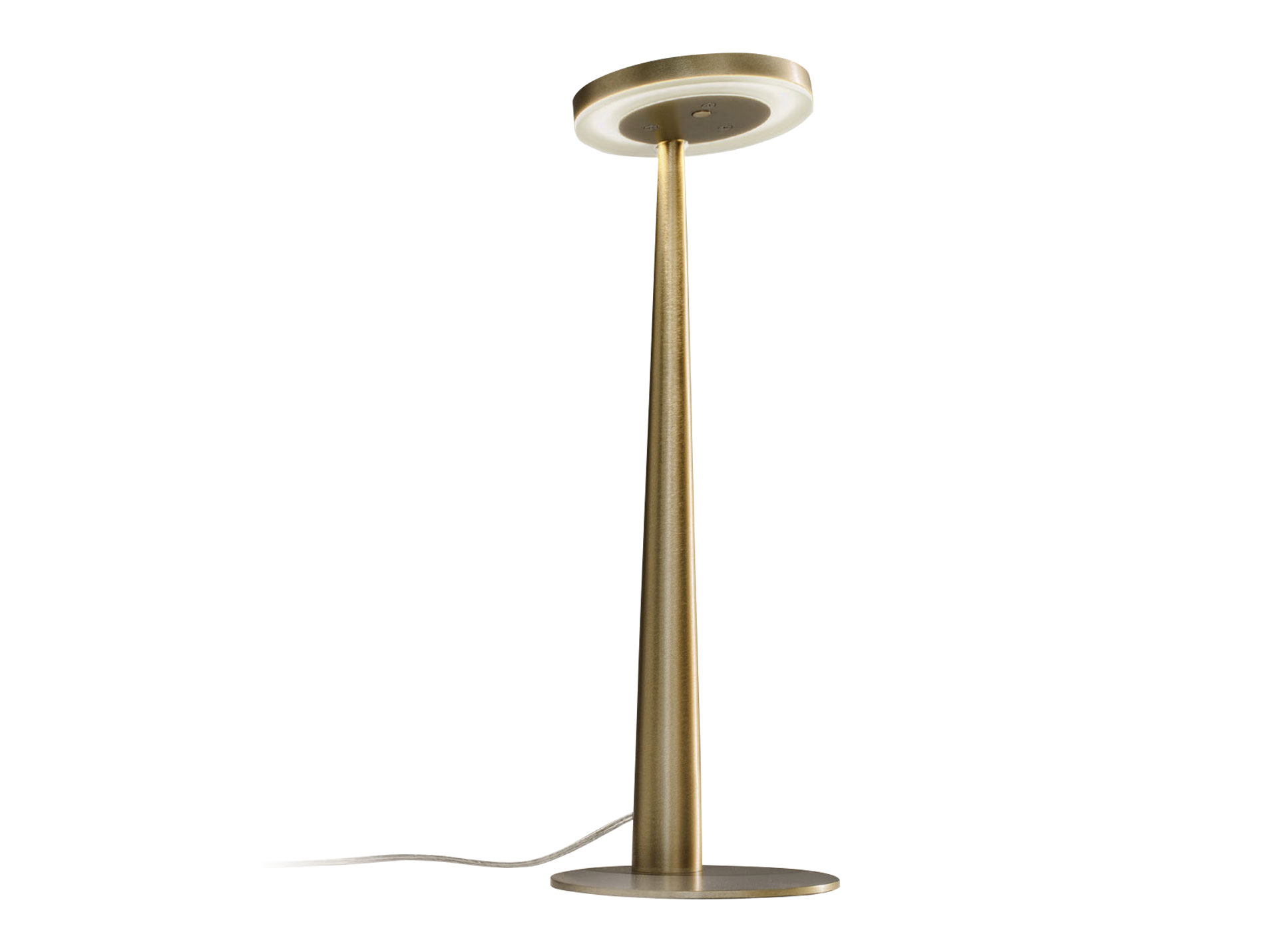 Lampada da sospensione, tavolo e parete (disponibile anche a incasso) con testa in pressofusione di alluminio. Diffusore in materiale acrilico con perimetro luminoso. Braccio conico decentrato, testa orientabile e comando Step DIM a 5 regolazioni di intensità luminosa caratterizzano le versioni da tavolo e parete, quest’ultima con snodo anche alla base, per una maggiore flessibilità nel posizionamento. La versione a sospensione, testa fissa e con tige centrale è disponibile in versione a emissione diretta e indiretta. Disponibile paralume in tessuto color avorio “Bella vestita” disegnato da Matteo Thun, da ordinare separatamente. Bianco, nero, titanio, bronzo e ottone satinato le finiture disponibili.