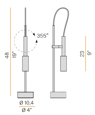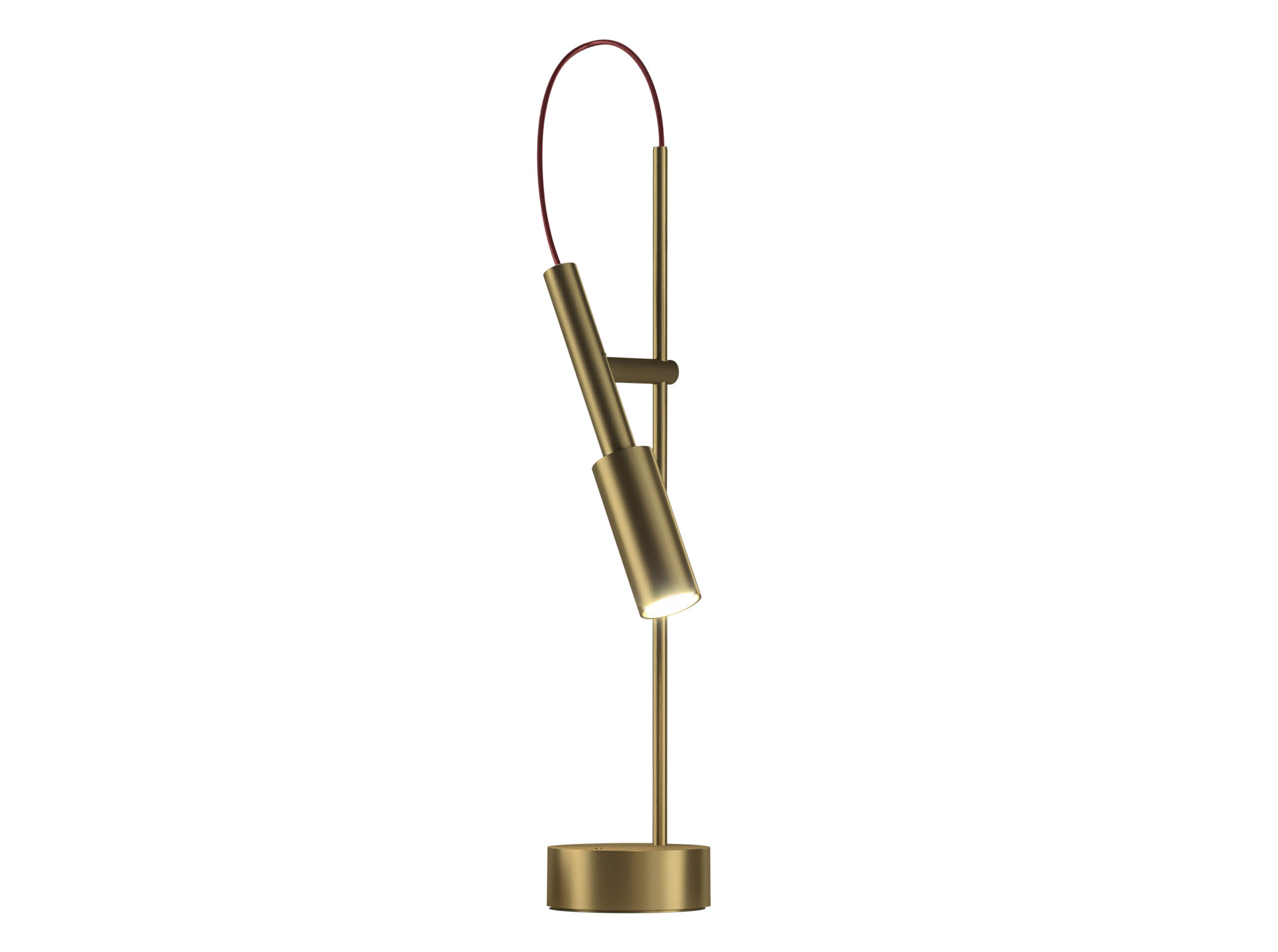 Lampada da tavolo in alluminio tornito. Tubino Plus è disponibile in versione con comando Step DIM a 5 regolazioni di intensità luminosa in finitura champagne, bronzo e titanio con cavo di alimentazione tra la testa e la struttura in tessuto.