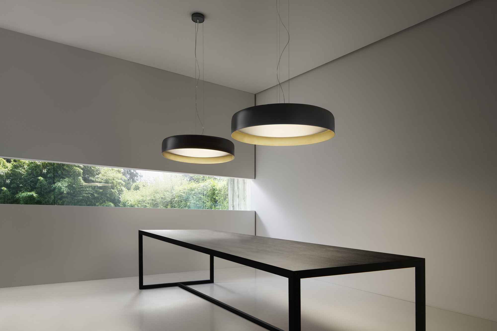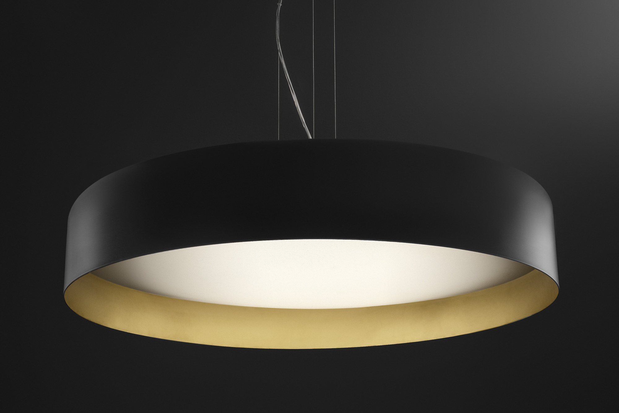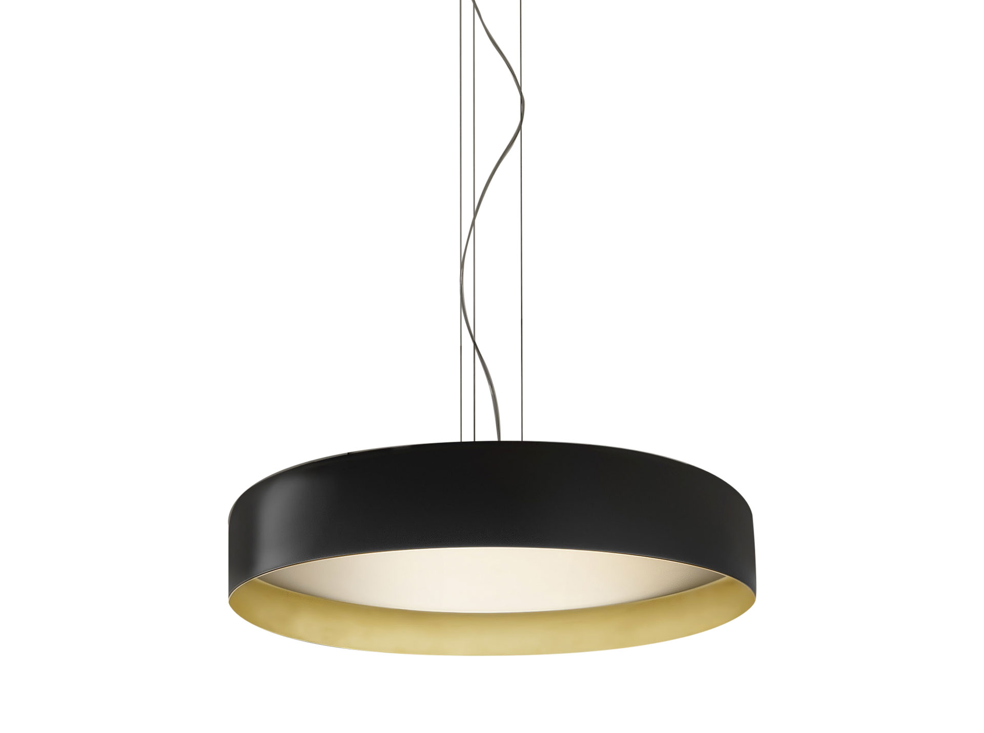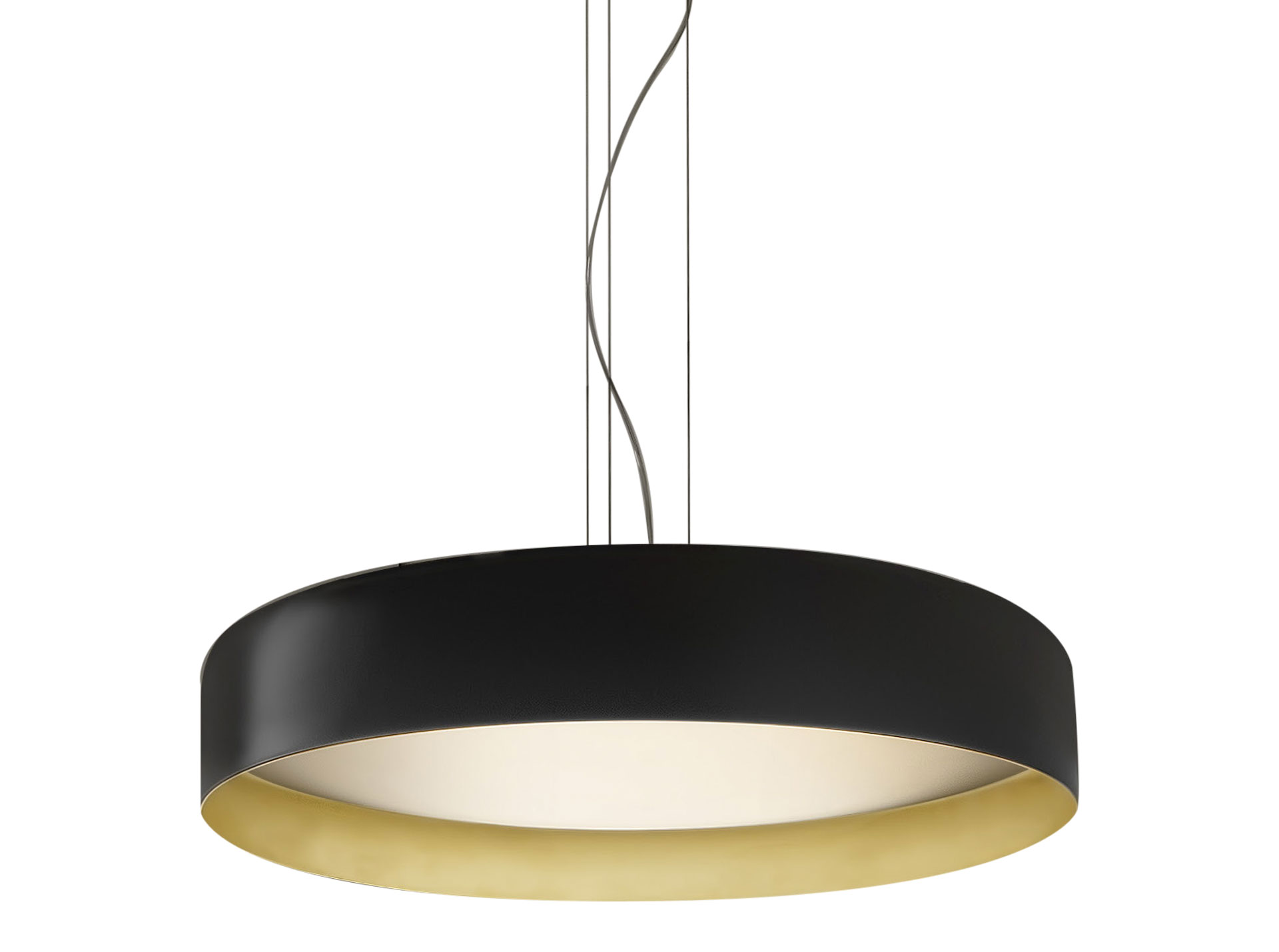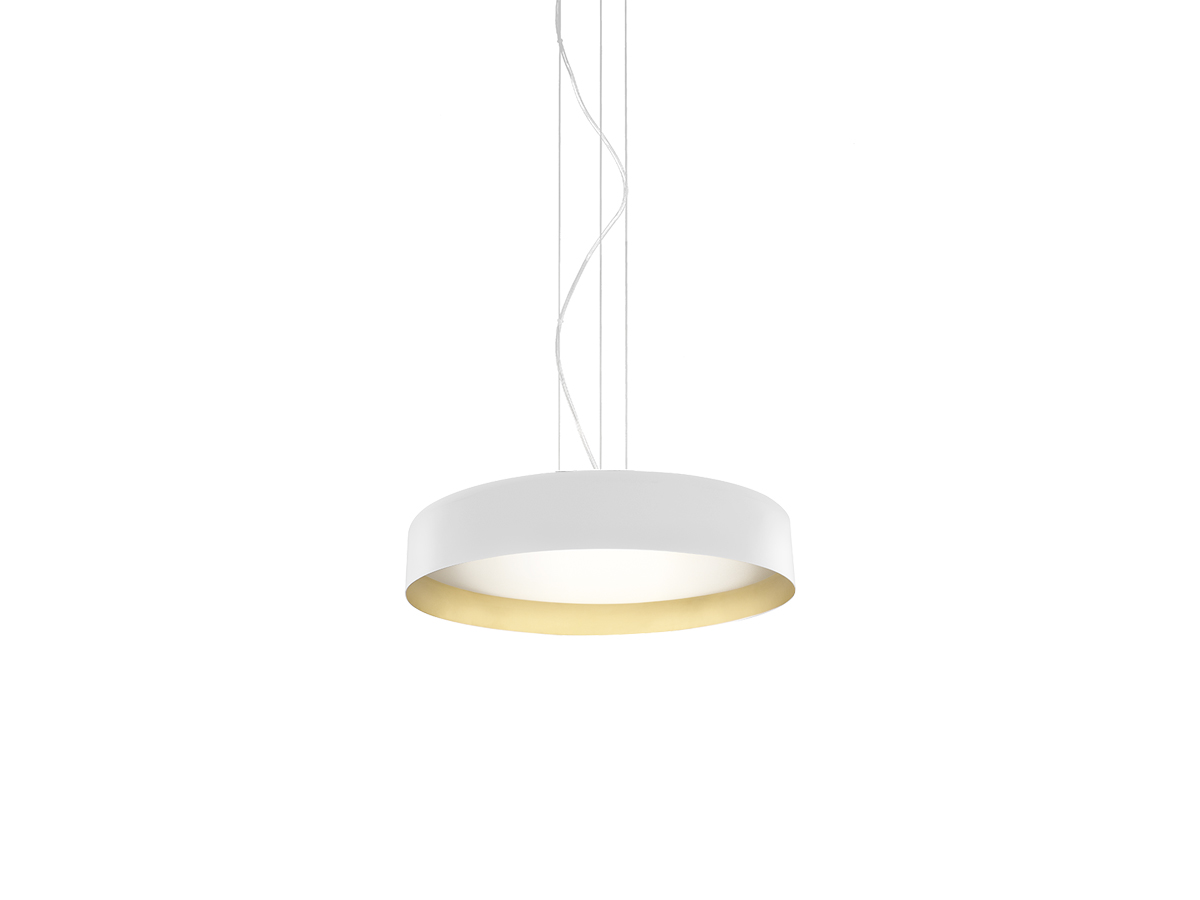 Lampada a sospensione e soffitto con diffusore microprismato a luminanza controllata. Versione a soffitto con emissione diretta attraverso modulo LED disponibile anche tunable white. La versione sospensione combina emissione diretta e indiretta dimmerabili. Corpo lampada in alluminio tornito rifinito con vernice poliacrilica nelle versioni esterno nero e interno oro o esterno bianco e interno oro. Possibili colori custom su richiesta. Ideale per hall, zone living, grandi spazi, e uffici.