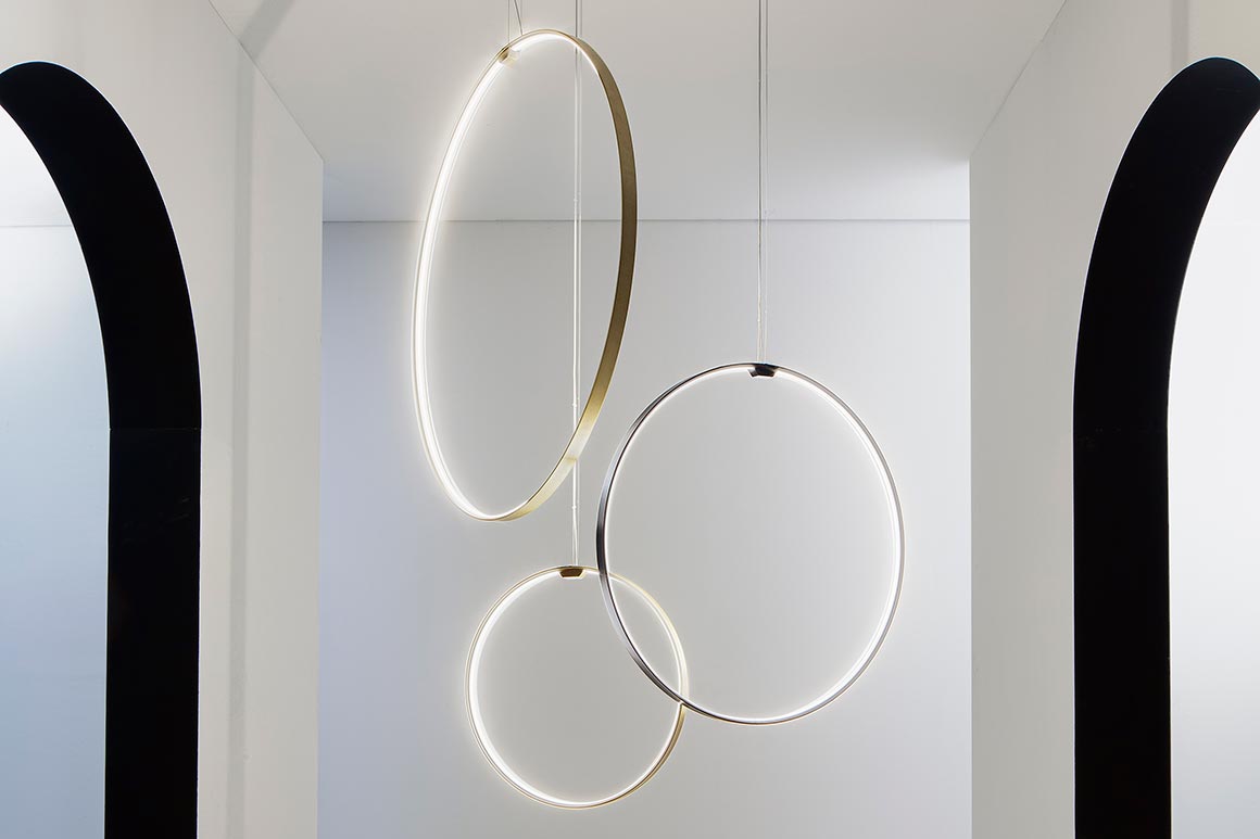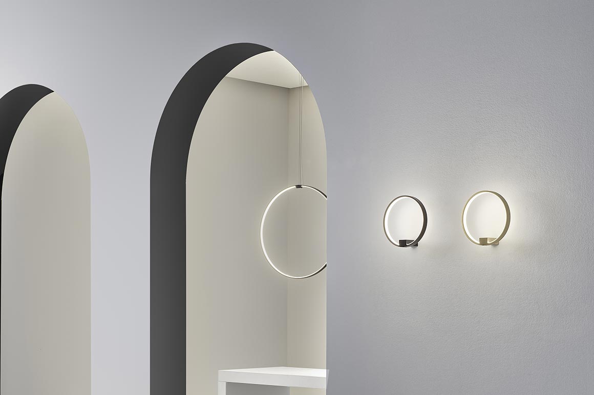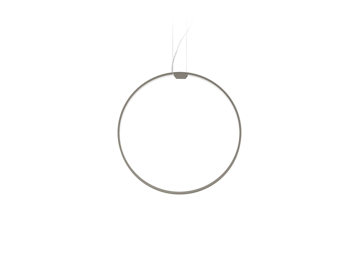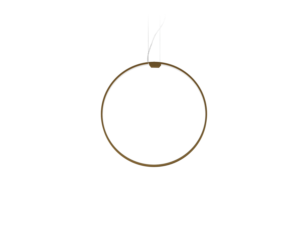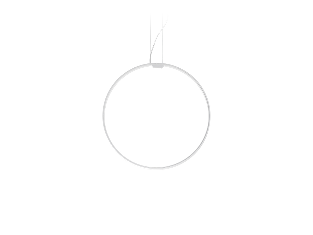 Lampada a sospensione verticale in alluminio estruso curvato con schermo in policarbonato opale. Emissione interna attraverso modulo LED e tecnologia DALI/Push DIM di serie su tutte le versioni inserita nel rosone. Anello rifinito con vernice poliacrilica color bianco, nero, titanio, bronzo e ottone satinato. Possibili colori custom su richiesta. Disponibilità di rosone per installazioni singole e rosoni per composizioni multiple da ordinare separatamente. Ideale per uffici, hall, zone living, grandi spazi, anche in abbinamento con Zero Round Acoustic e Arena Acoustic.