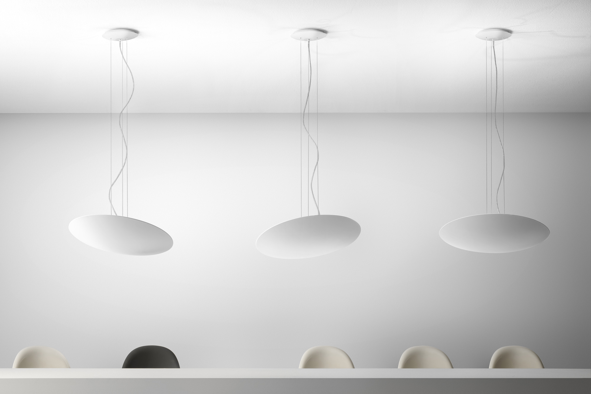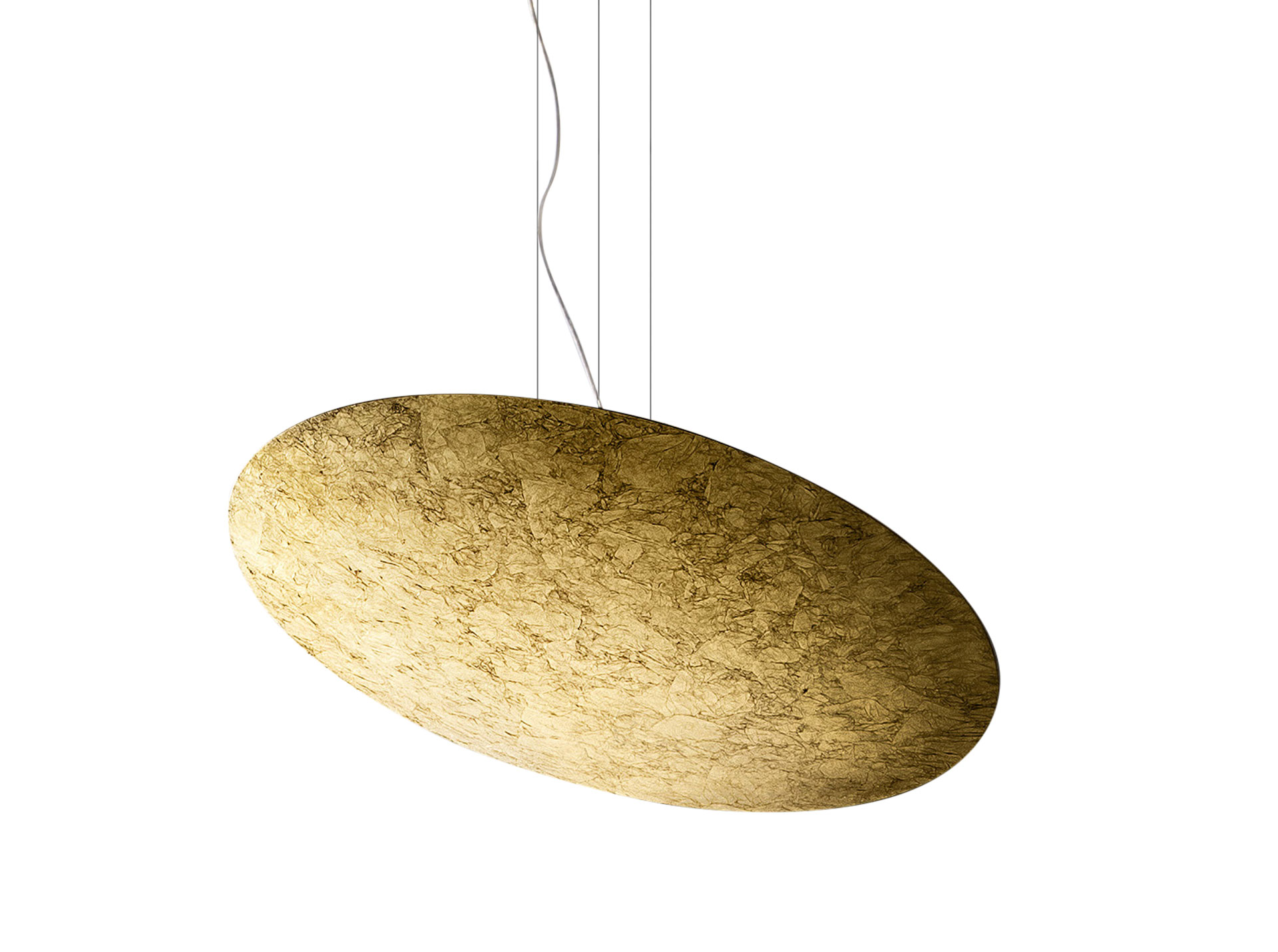 Lampada a sospensione in alluminio tornito. Emissione indiretta attraverso COB LED con dimmerazione DALI/Push DIM integrata. Disco rifinito con vernice poliacrilica color bianco, nero e decorata a mano con foglia oro. Possibili colori custom su richiesta. Ideale per hall, zone living, grandi spazi.
