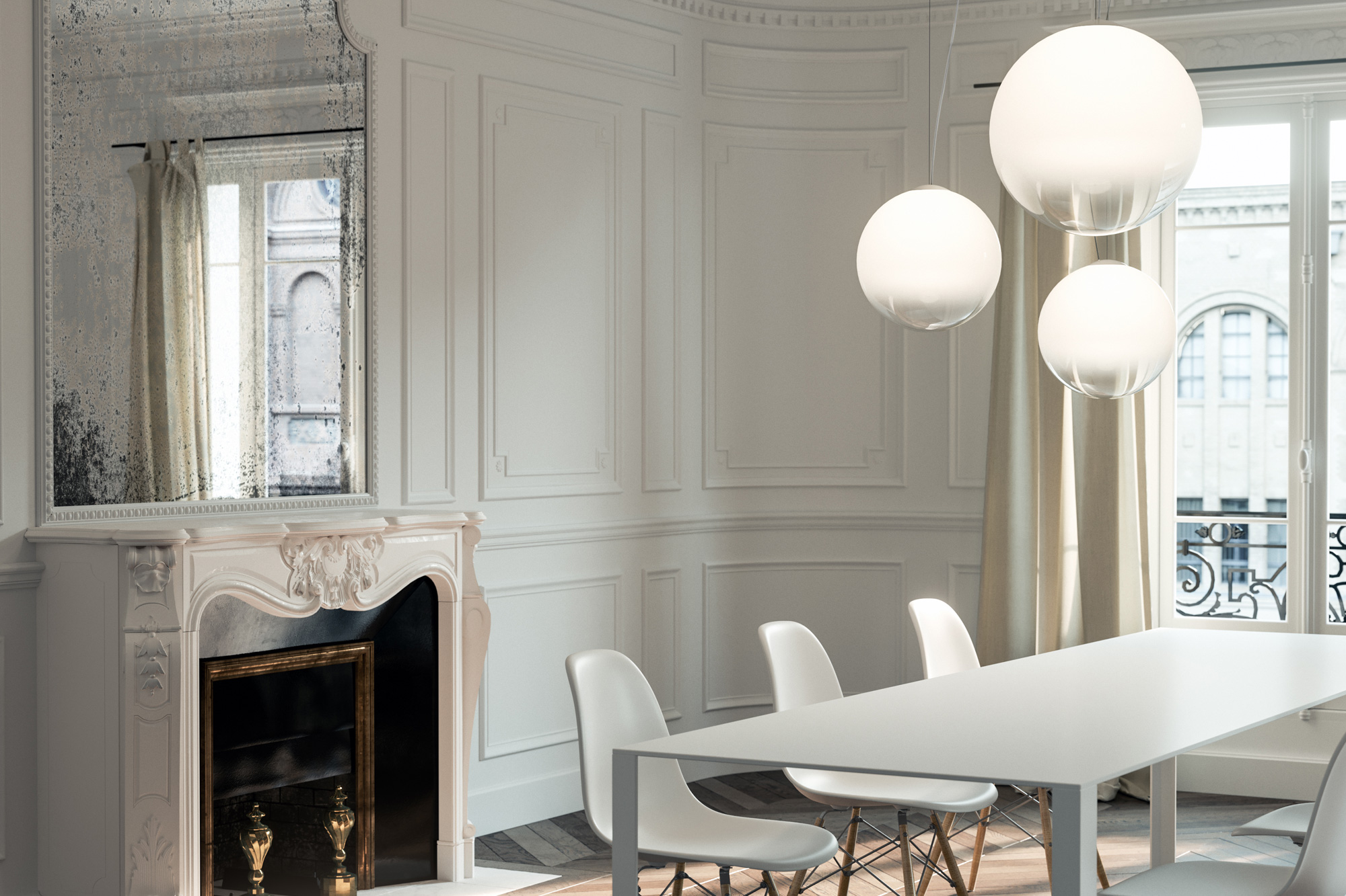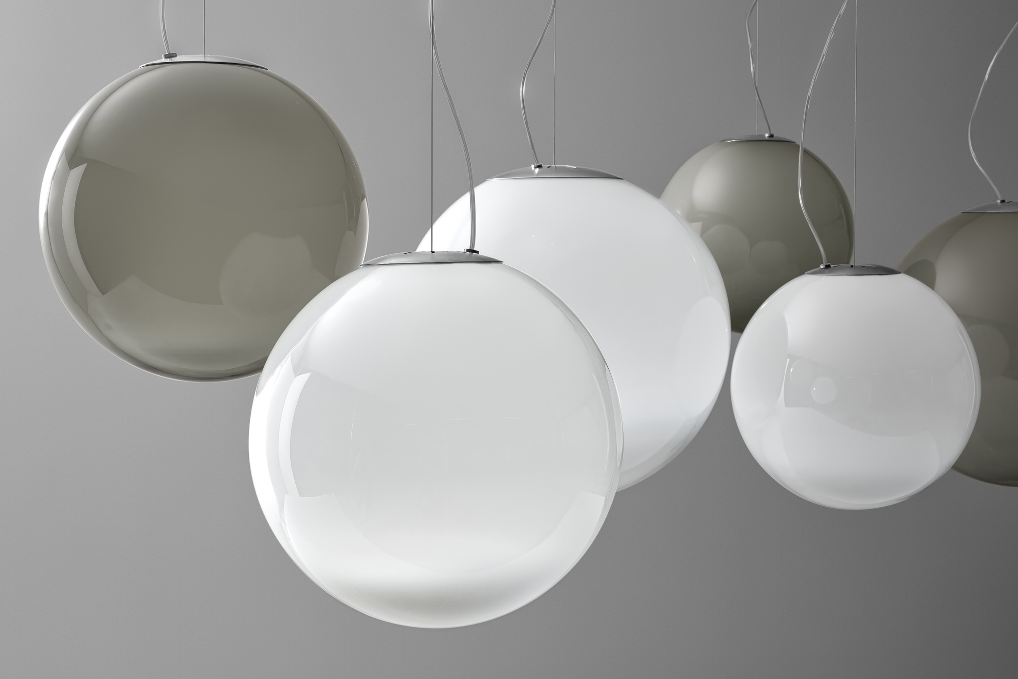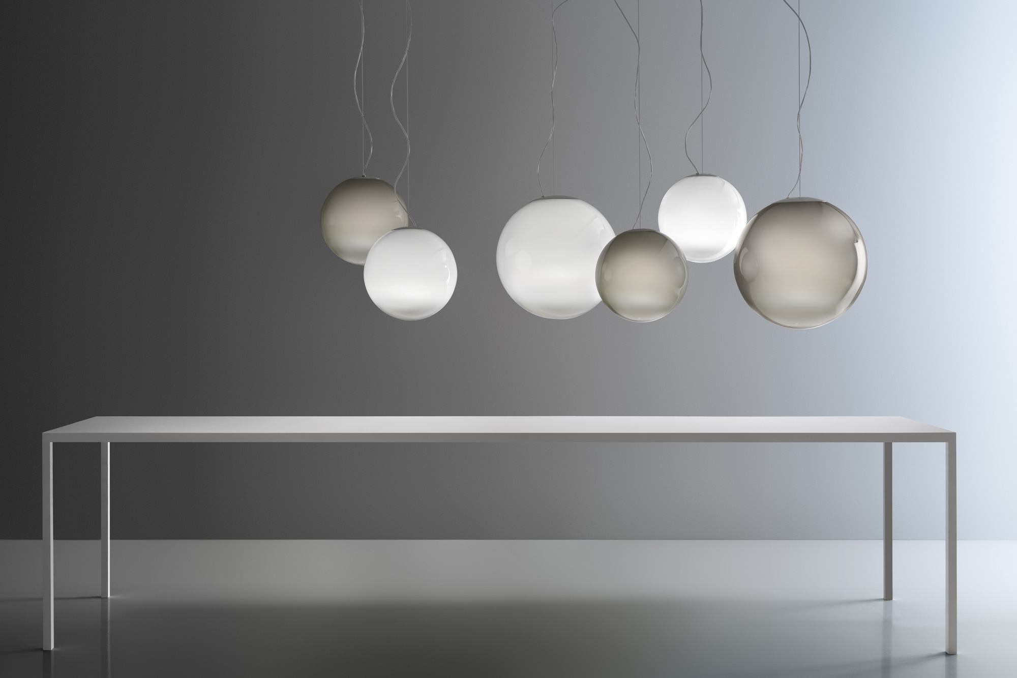 Lampada a sospensione in vetro soffiato lavorato a mano con effetto sfumato. Rosone in metallo spazzolato e verniciato colore titanio. Emissione di luce diffusa con attacco E27, lampadina LED dimmerabile inclusa. Vetro soffiato disponibile in tre misure, in colore bianco sfumato o fumè sfumato. Cavo elettrico trasparente.
